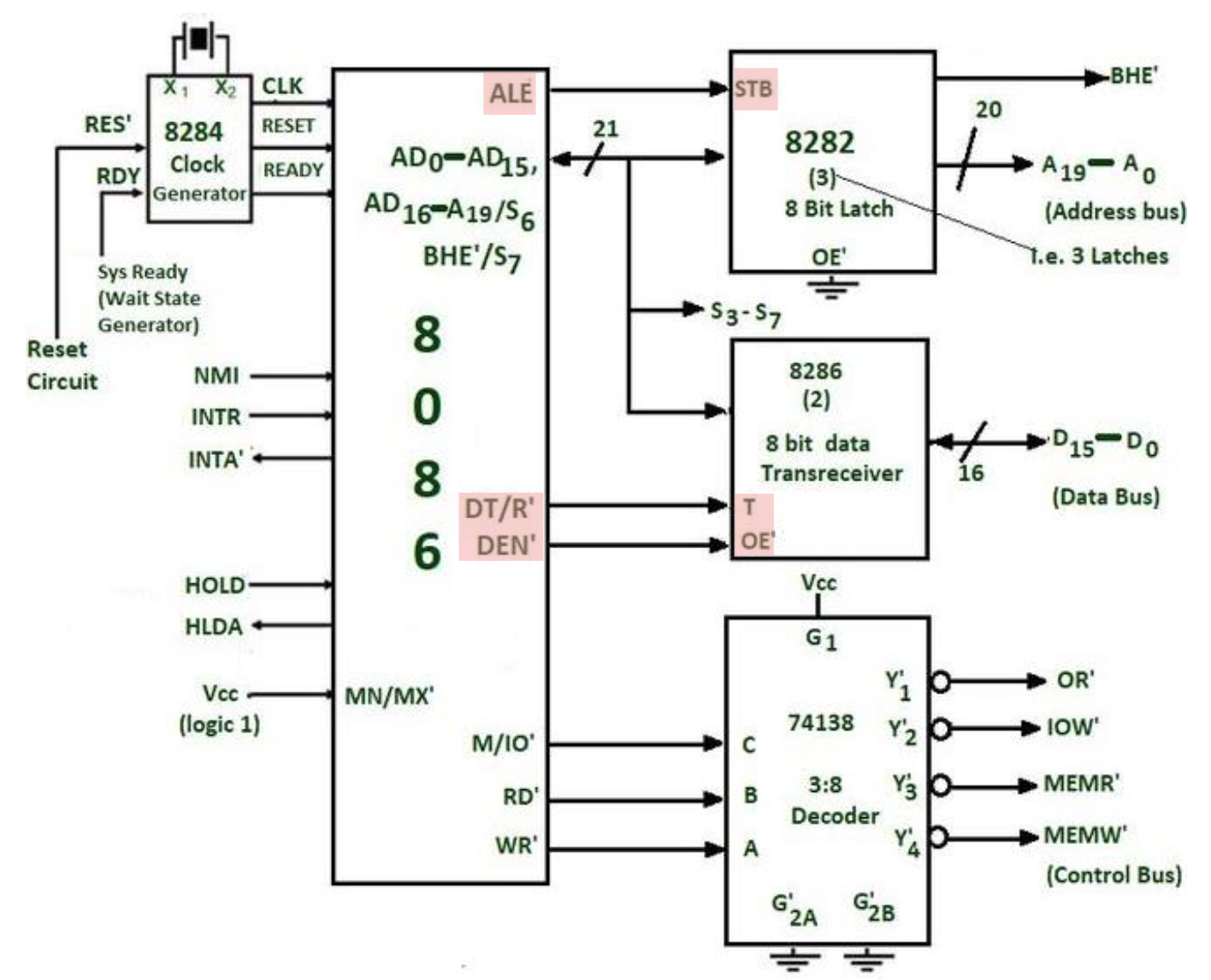 \(\text{BHE}\):在 8086 中,总线高使能(bus high enable) 引脚用于在读或写操作期间启用最高有效数据总线位(\(\text{D}_{15}–\text{D}_8\))