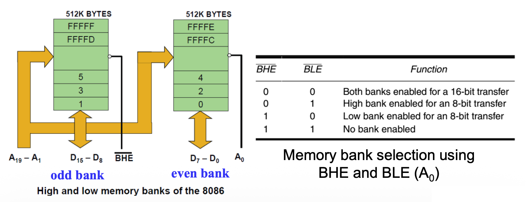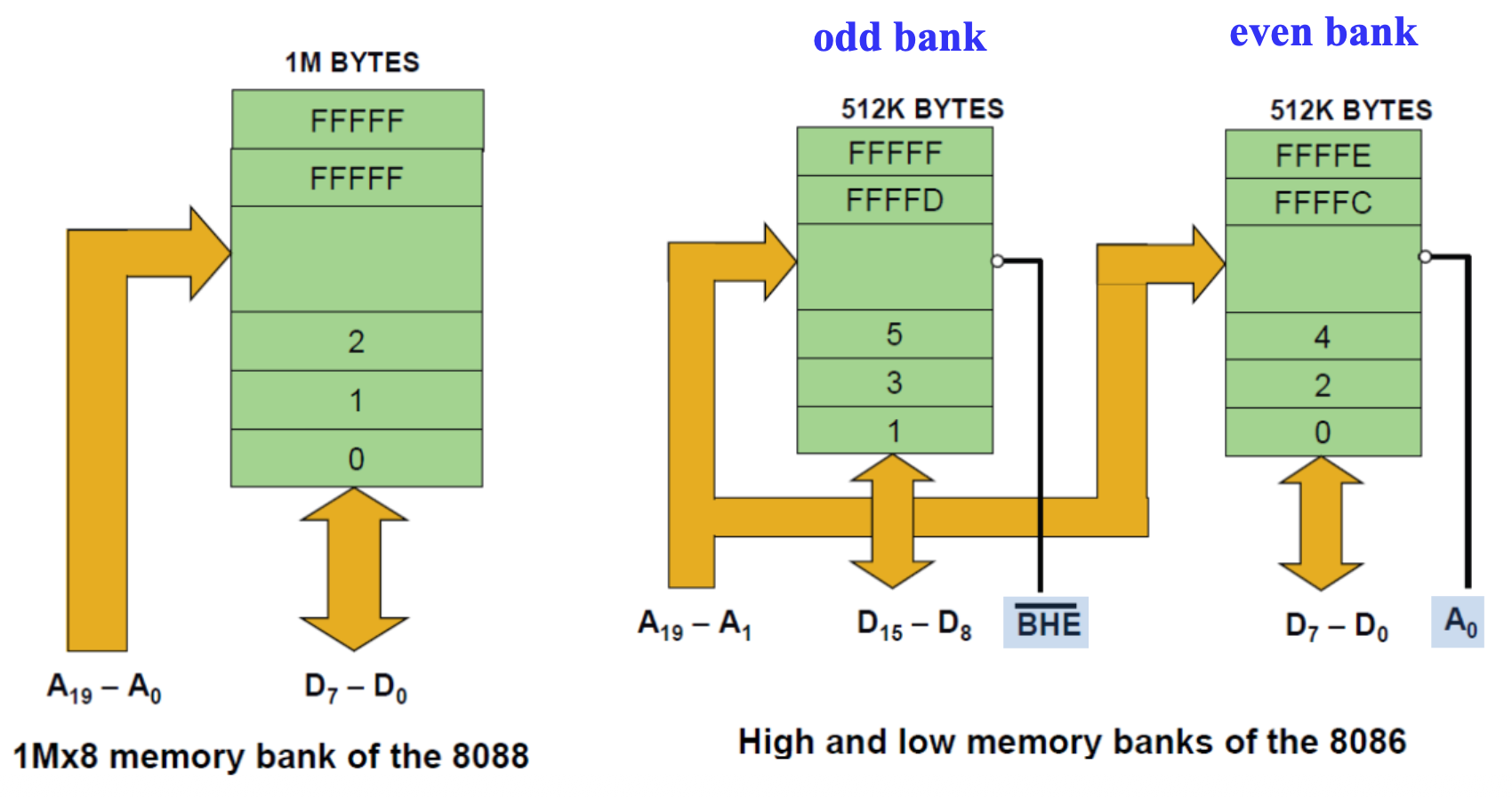 - 8086 有 16 位的数据总线,且内存地址空间实现为两个独立的 512 KB 内存库