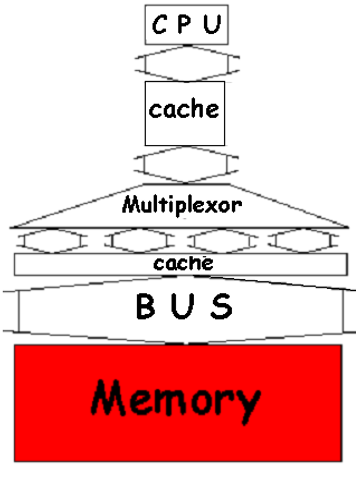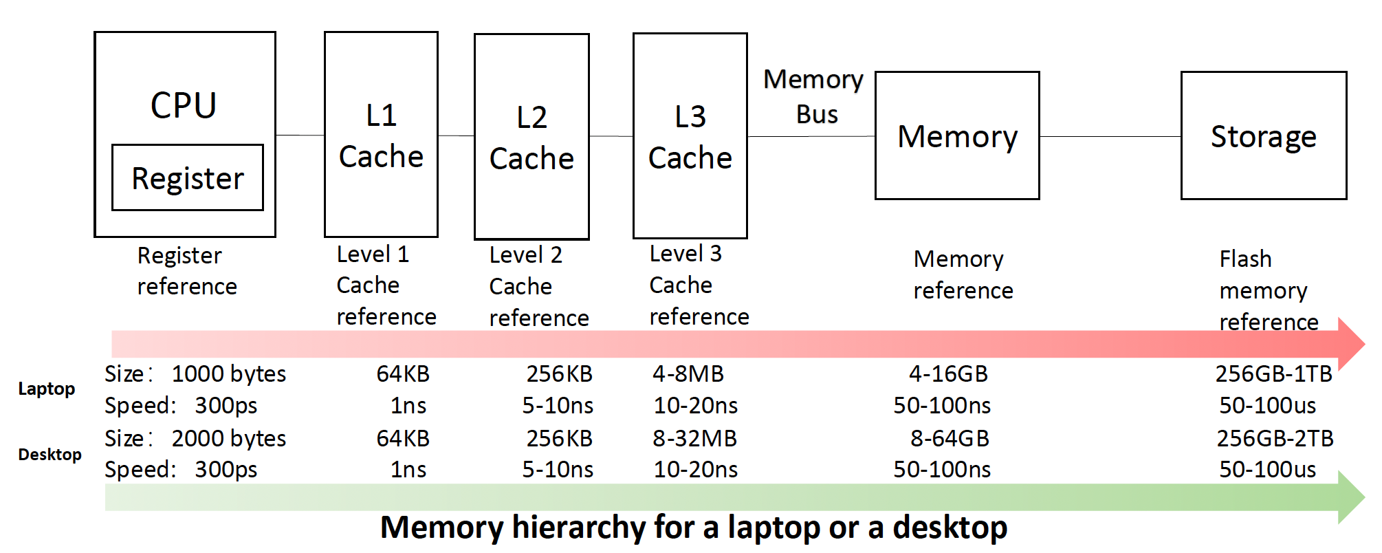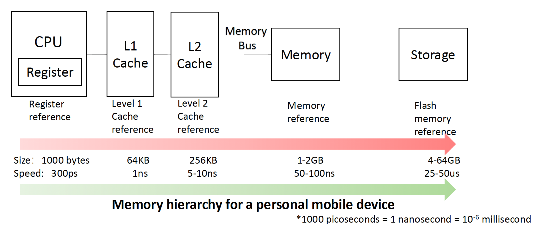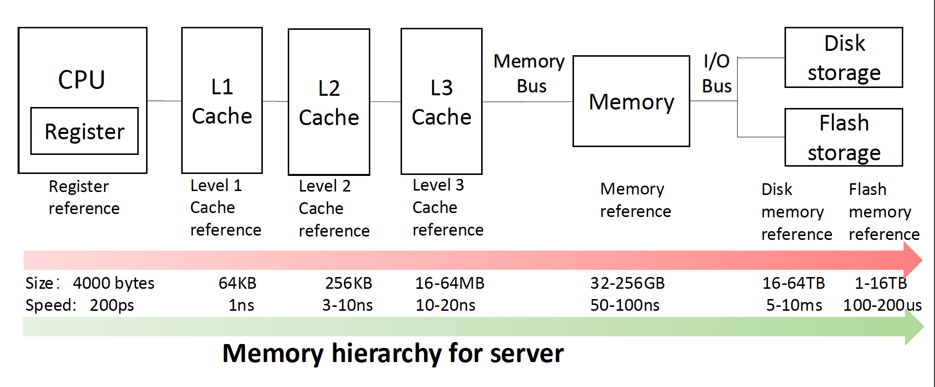 • 高速缓存(cache):位于存储器层级中最高层的存储器,直接与处理器连接。