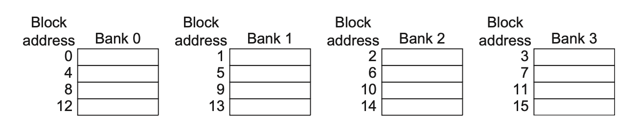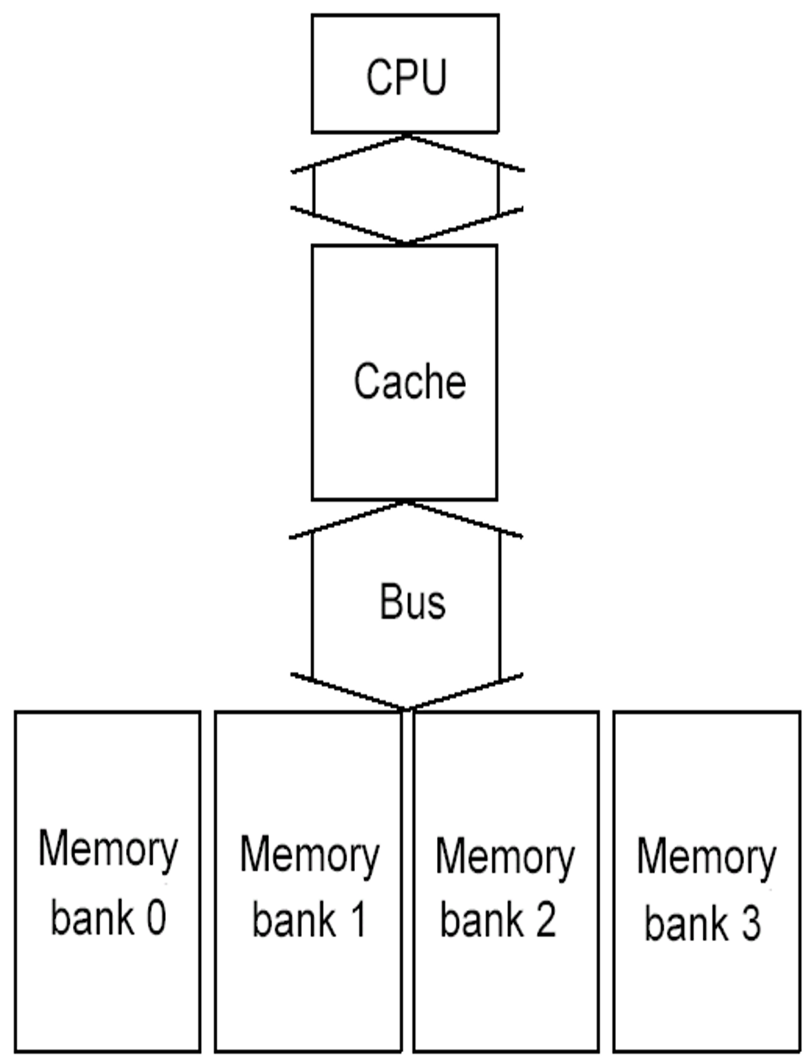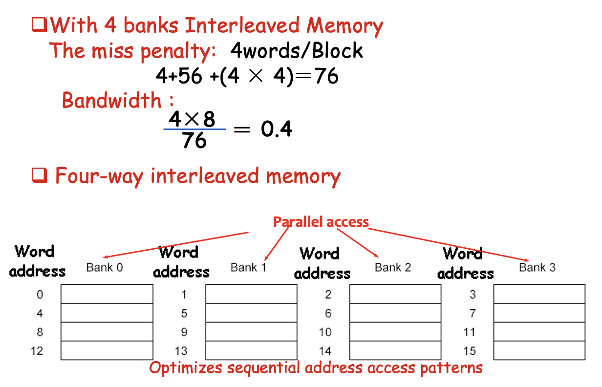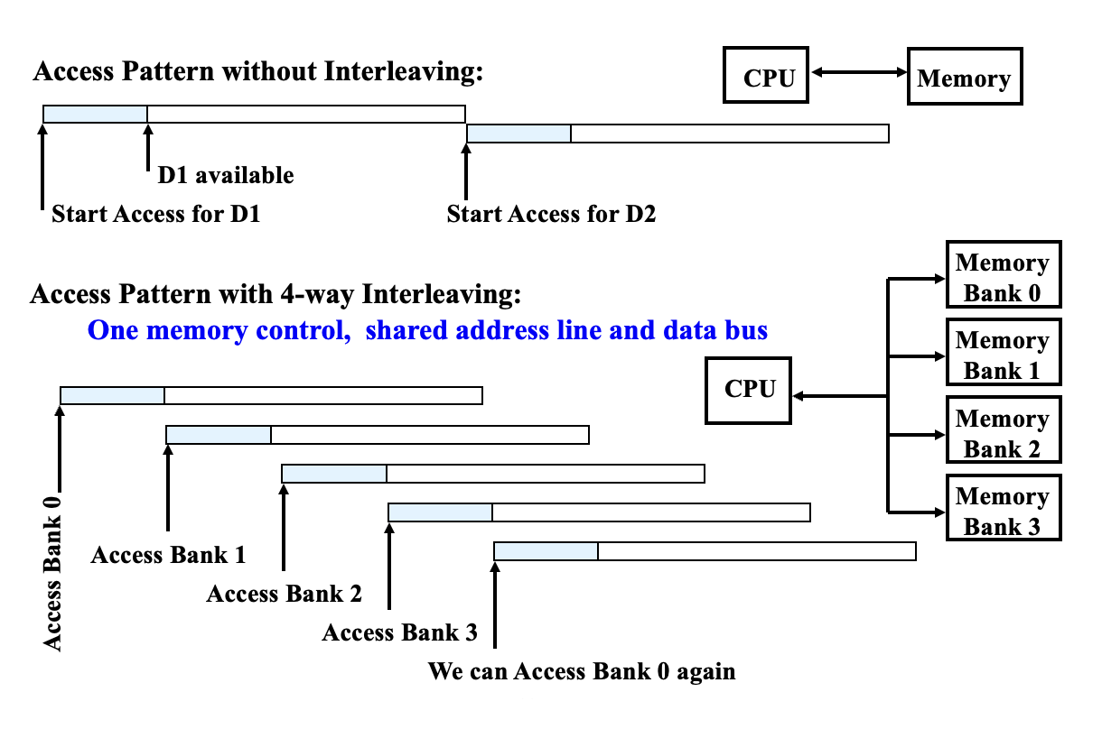• 简单的交错内存:将内存组织成多个分区,可以同时读写多个字。