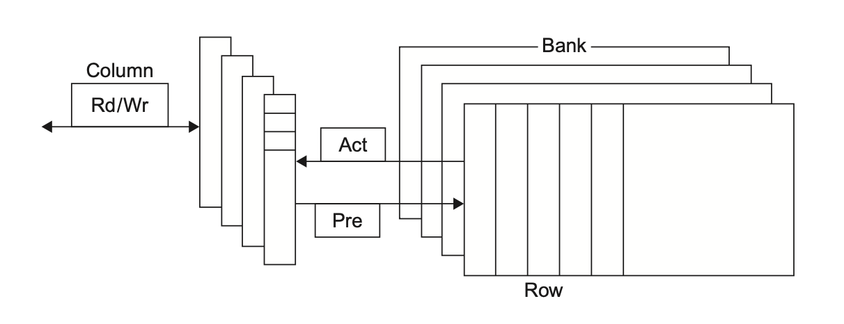 • 内部组织:DRAM 被组织成多个分区(bank),每个分区包含行和列。访问数据需要激活行(ACT 命令,然后通过列地址选通(CAS)读取数据。