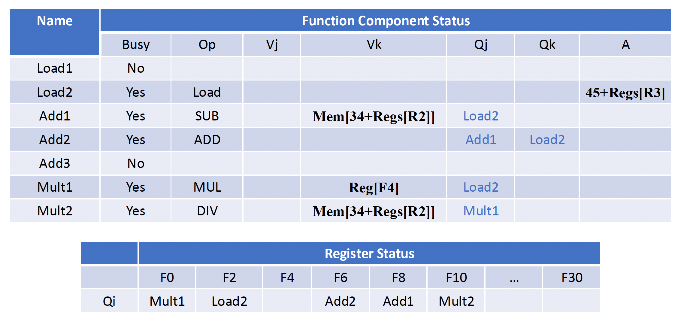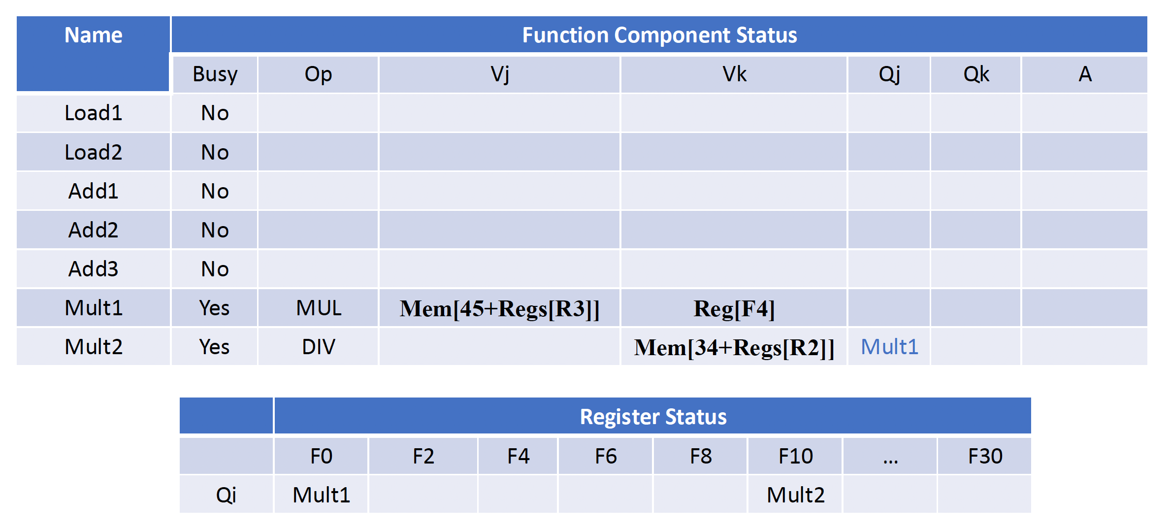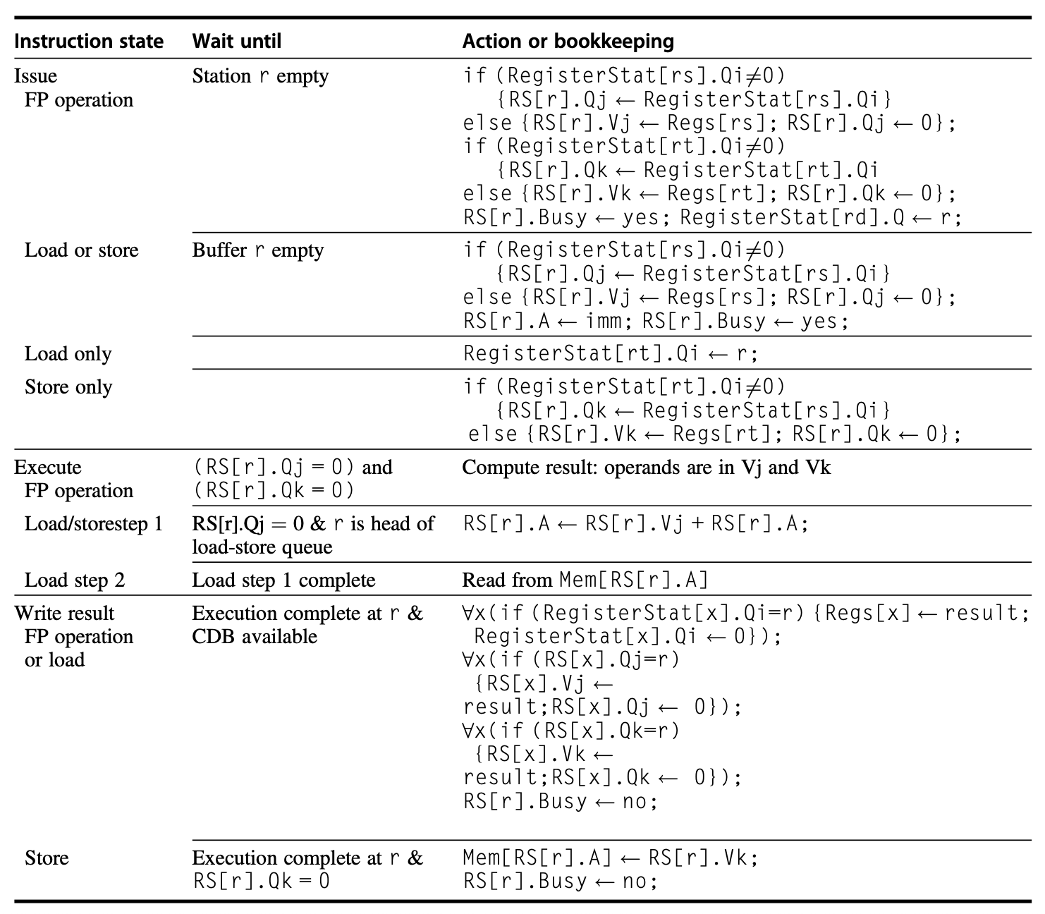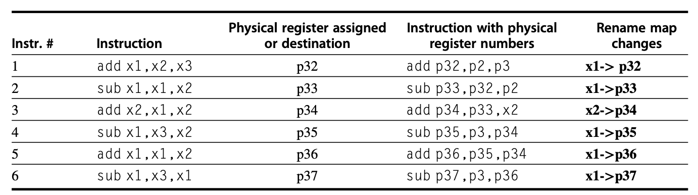 在指令发射的过程中,重命名进程会将架构寄存器的名称映射到物理寄存器的编号上,为其分配一个新的未使用的寄存器作为目标。通过该方法,WAW 和 WAR 冒险能够被避免,且推测恢复也能够被处理,因为保存指令目标的物理寄存器在指令提交前,尚未成为架构寄存器。重命名映射(renaming map) 是一种简单的数据结构,提供了与指定架构寄存器当前对应的物理寄存器编号,这是由托马苏洛算法中寄存器状态表执行的功能。