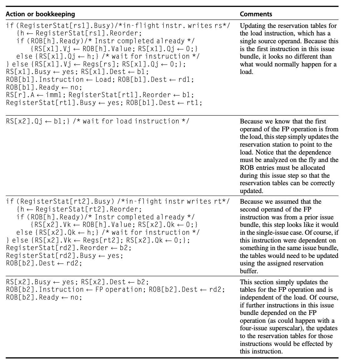 - 如果发射包内的某条指令依赖于发射包内前面的指令,那么使用被分配的 ROB 编码来更新依赖指令的保留站。否则的话就使用现有的保留站和 ROB 来更新正在发射的指令的保留站