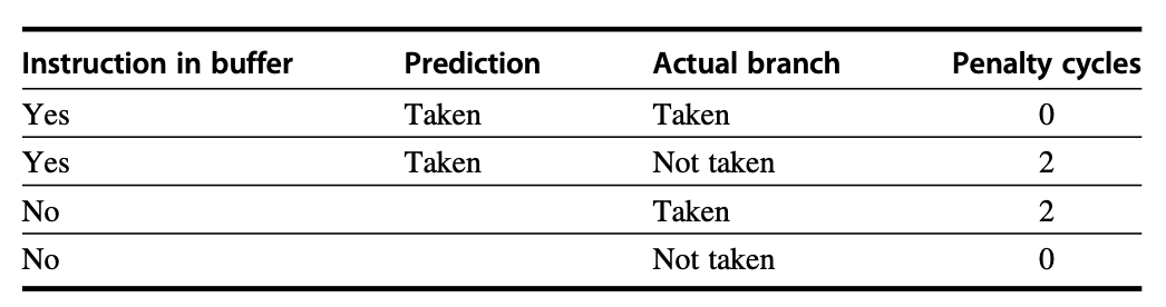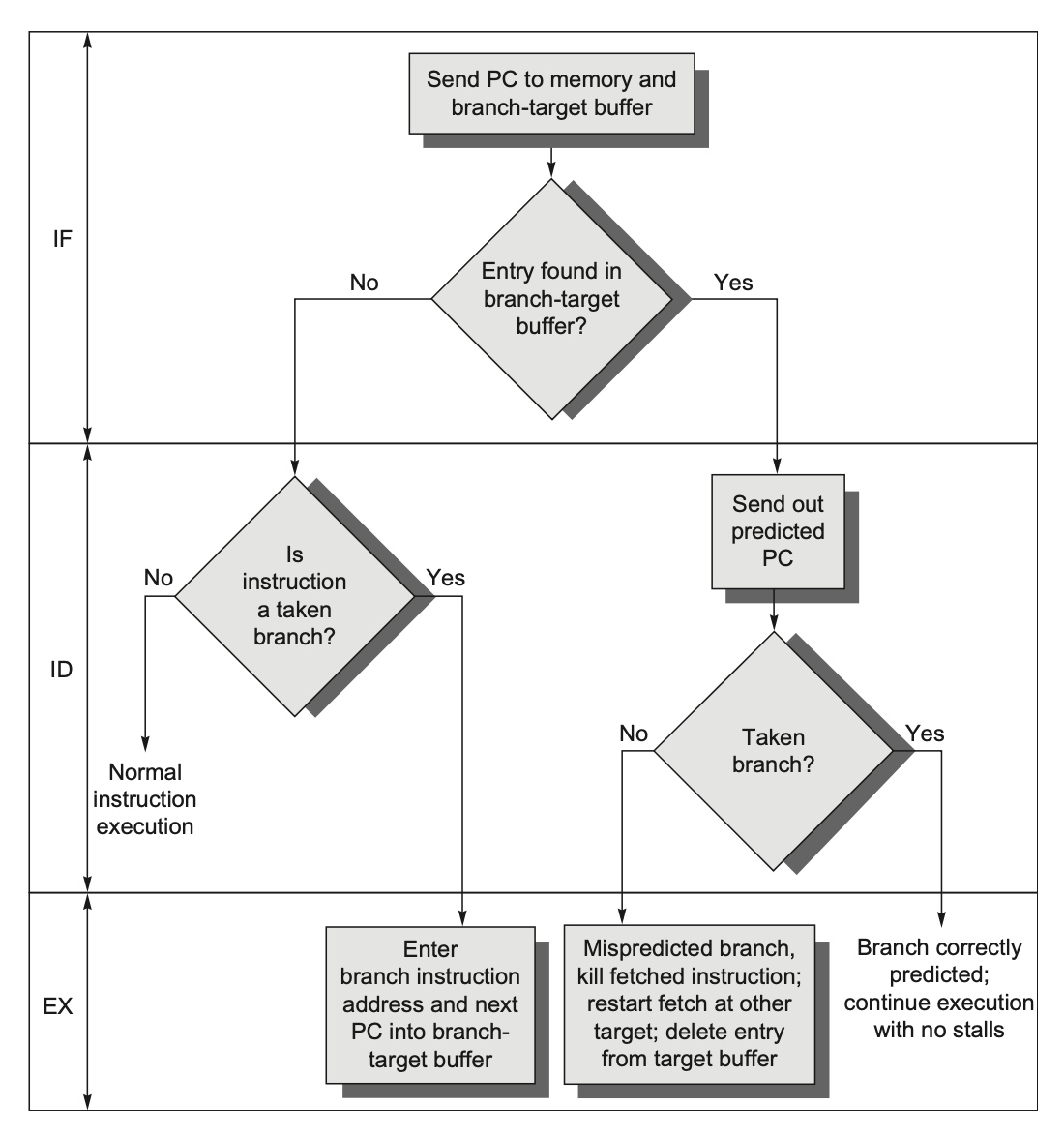 由于分支 - 目标缓冲区预测了下一条指令的地址,并且在译码指令前需要将其发送出去,因此我们必须知道取得的指令是否被预测为一个要跳转的分支。如果取得的指令的 PC 值和预测缓冲区的地址匹配上的话,那么对应的被预测的 PC 被用作下一个 PC。此外,我们仅需在分支 - 目标缓冲区内存储预测要跳转的分支就行了,因为不跳转的分支应该只获取下一条顺序指令就行了。