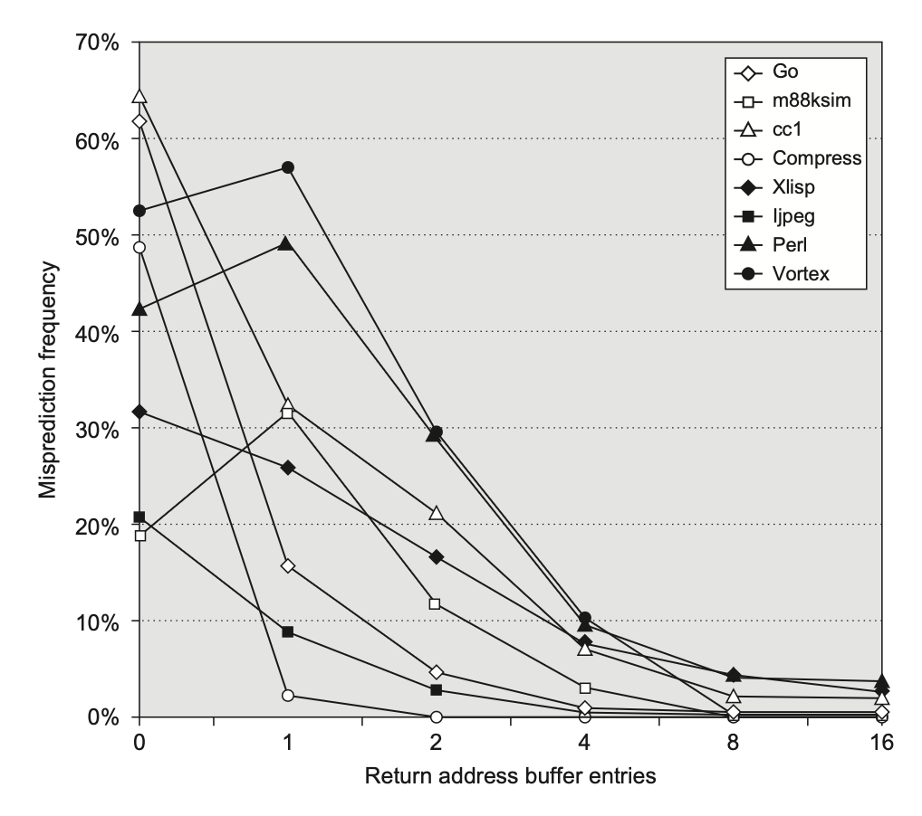 为了克服这种问题,一些设计会采用一块较小的返回地址缓冲区,在栈上进行操作。这个结构会为最近的返回地址缓存,当调用过程时将返回地址压入栈内,返回时则将其弹出。如果这个缓存足够大的话,那么它能够完美预测返回地址。下图展示了不同大小的返回缓冲区下的性能: