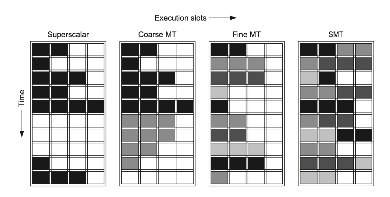 - SMT 利用线程级并行来隐藏处理器中长延迟事件,从而增加功能单元的利用率