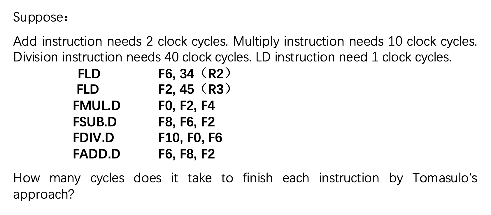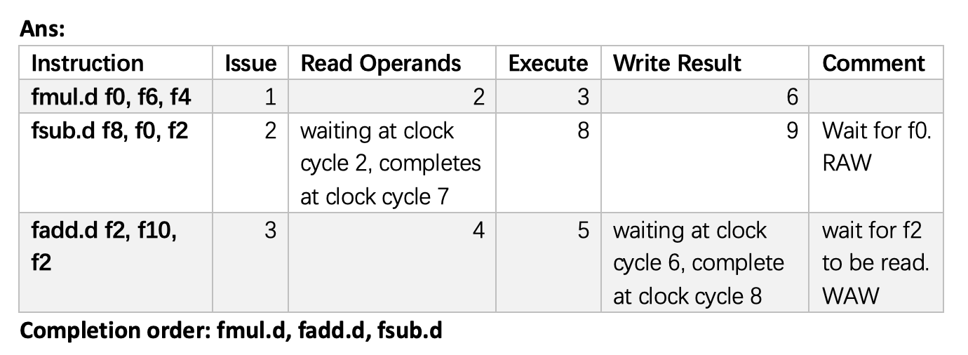 WAW(write after write):j 尝试在 i 写入某个操作数之前向它写入,这样导致写操作的执行顺序错误,该操作数的最终结果是 i 写入的结果而非 j。该冒险对应输出依赖,且仅存在于允许在多个阶段写入数据的流水线,或者允许指令在前一条指令停顿时继续执行的情况下。比如: