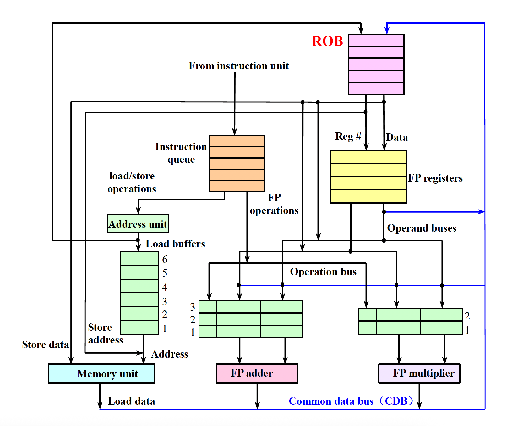 一种替代 ROB 的方案是使用一组更大规模的寄存器组,并结合寄存器重命名技术,该方法还建立在托马苏洛算法的基础上。在托马苏洛算法中,在执行的任意时间点上,架构可见的寄存器(architecturally visible registers) 的值被包含在寄存器组和保留站内。如果使用推测技术的话,那么寄存器之可能还会临时位于 ROB 内。