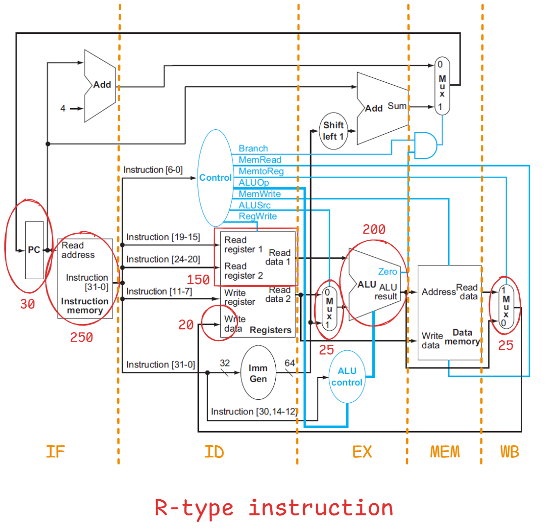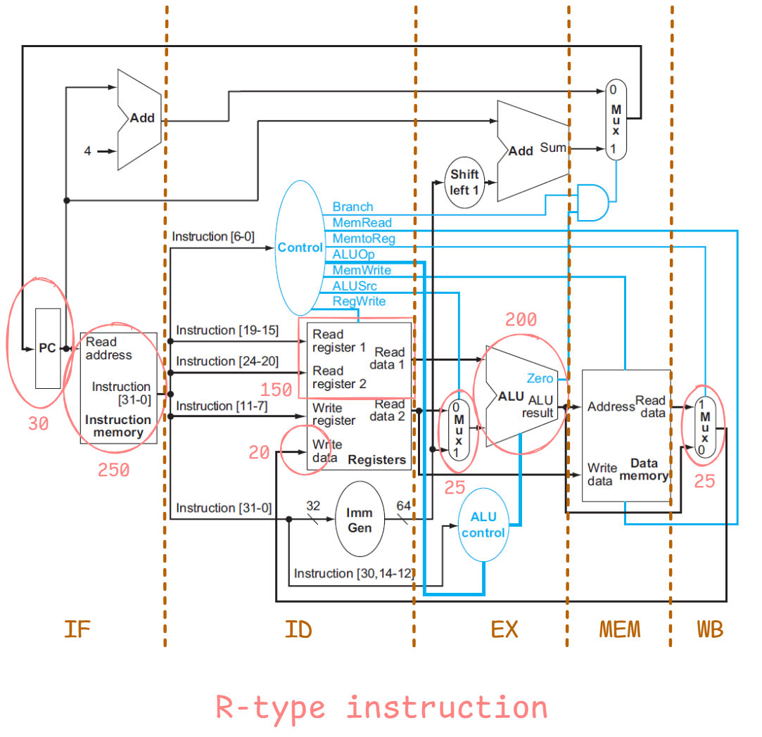 - 左上角:PC 的来源有两个:PC + 4(靠左的 Add)或者是由指令指定的地址(靠右的 Add)