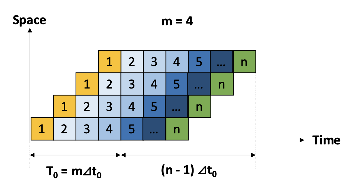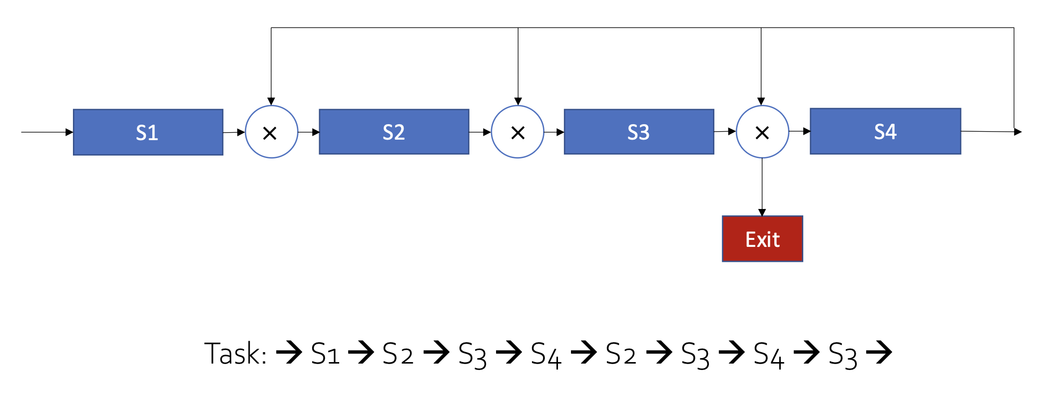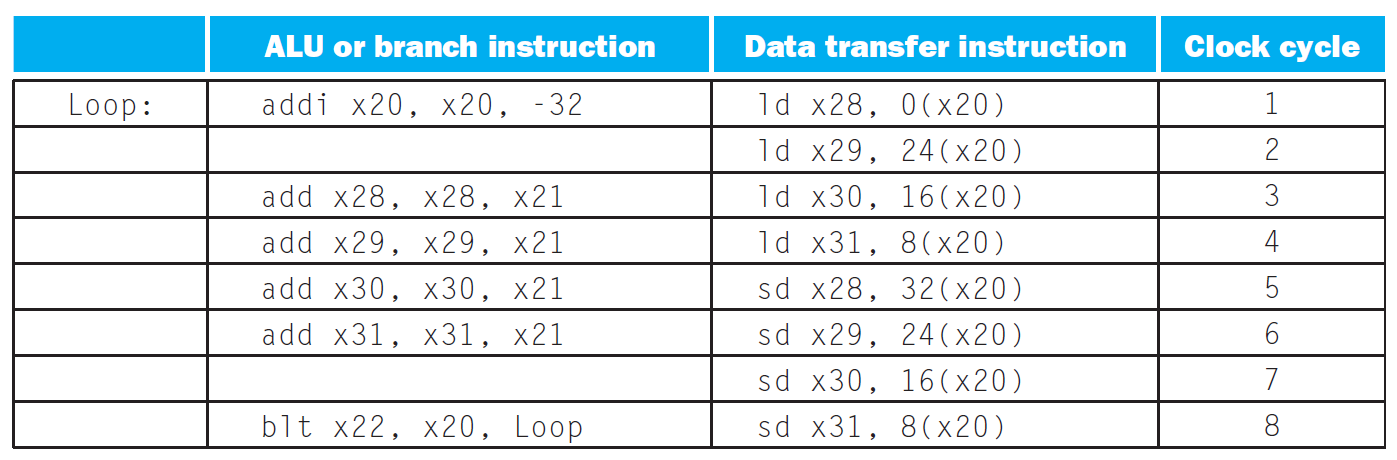 对于前面给出的循环代码,我们可以先复制 4 份循环体的指令,然后重新安排这些指令,并去除没用的指令,这样下来我们保留了 4 份ld、add和sd指令,而仅保留 1 份的addi和blt指令。下图展示了新的指令执行安排: