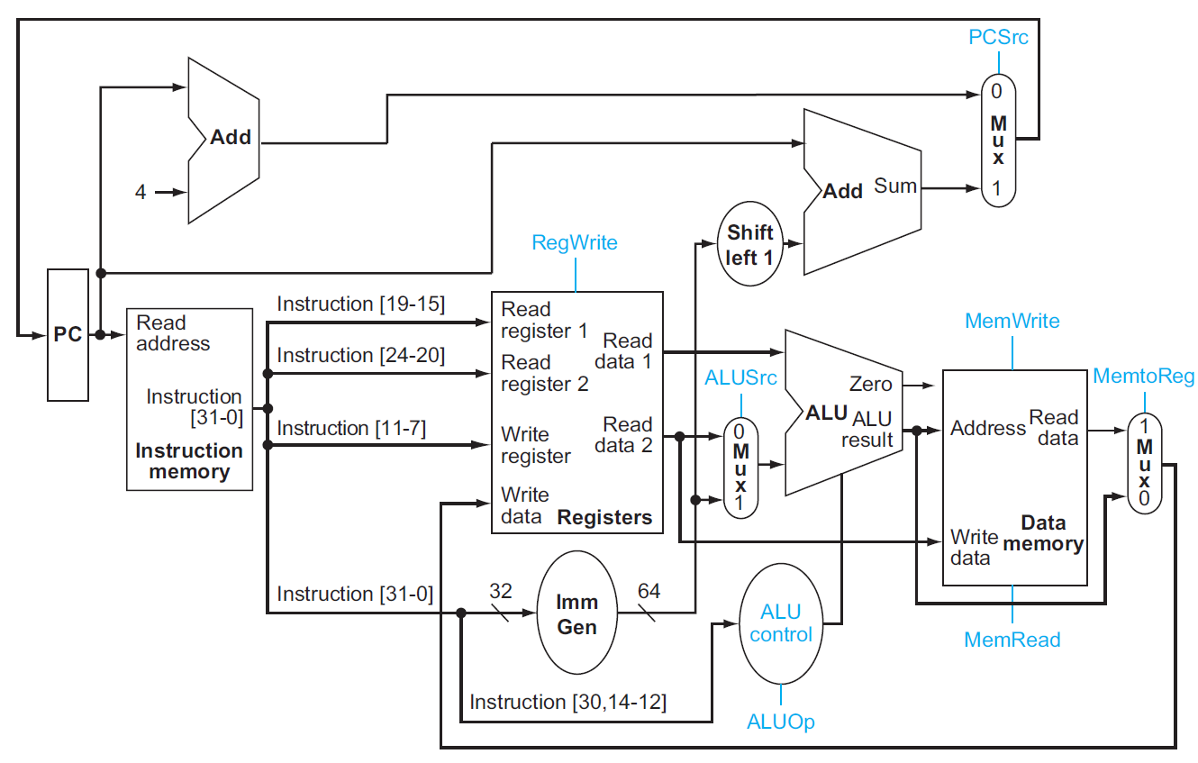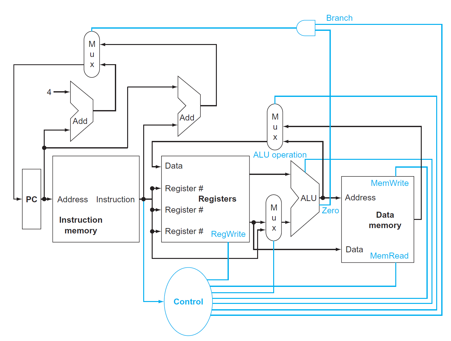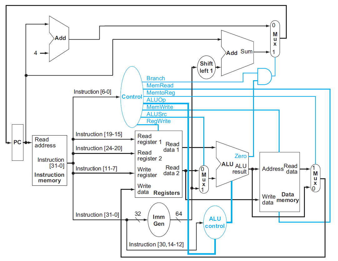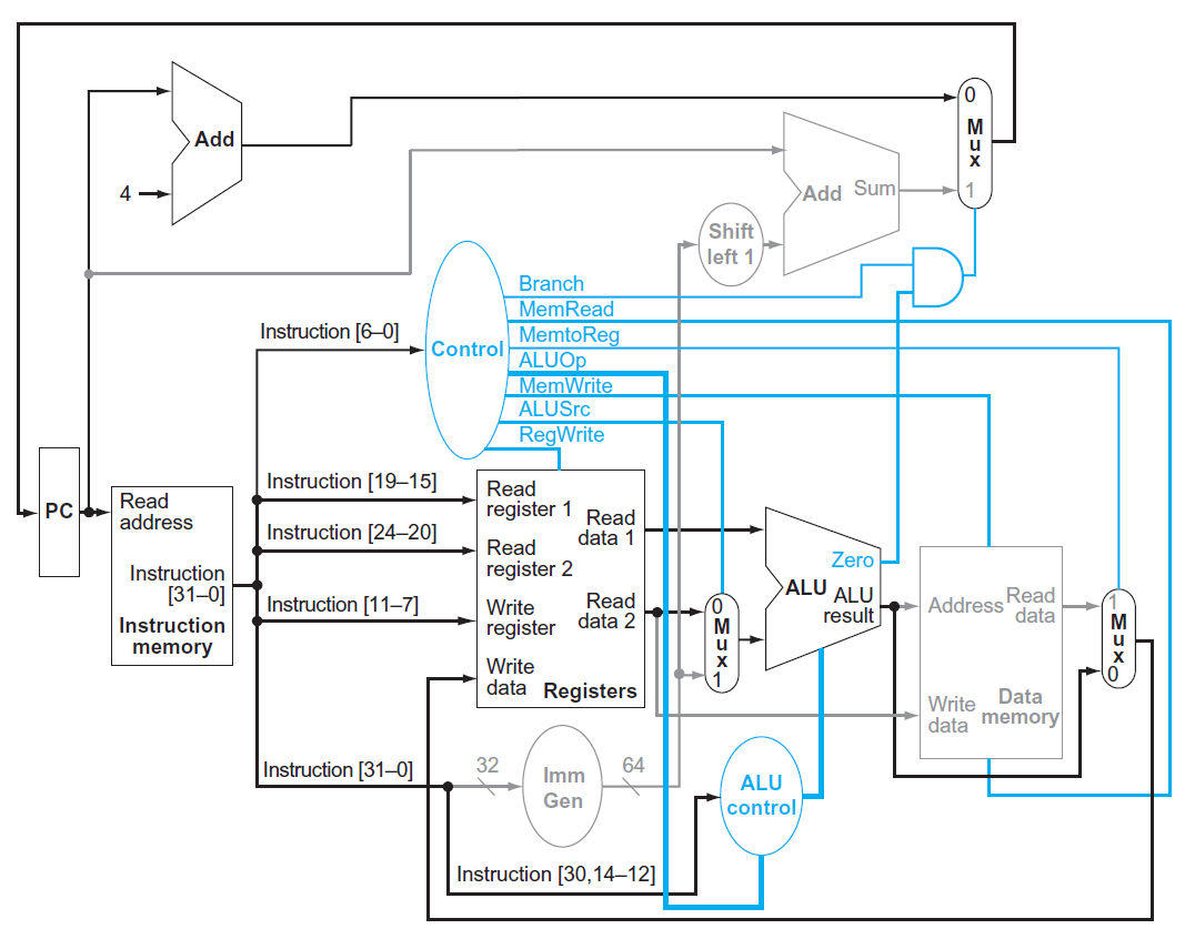 显然,一个输入端不可能同时接受两个来源的数据,因此需要由一个多路选择器(multiplexor, MUX),根据来自控制单元的控制信号(从指令中获取)去选择其中一个来源。下图展示了添加控制单元后的原理图: