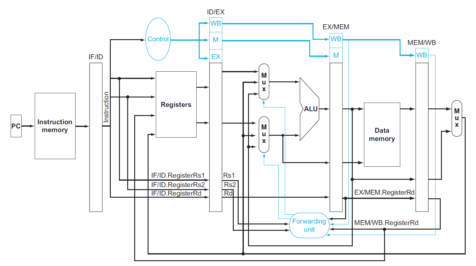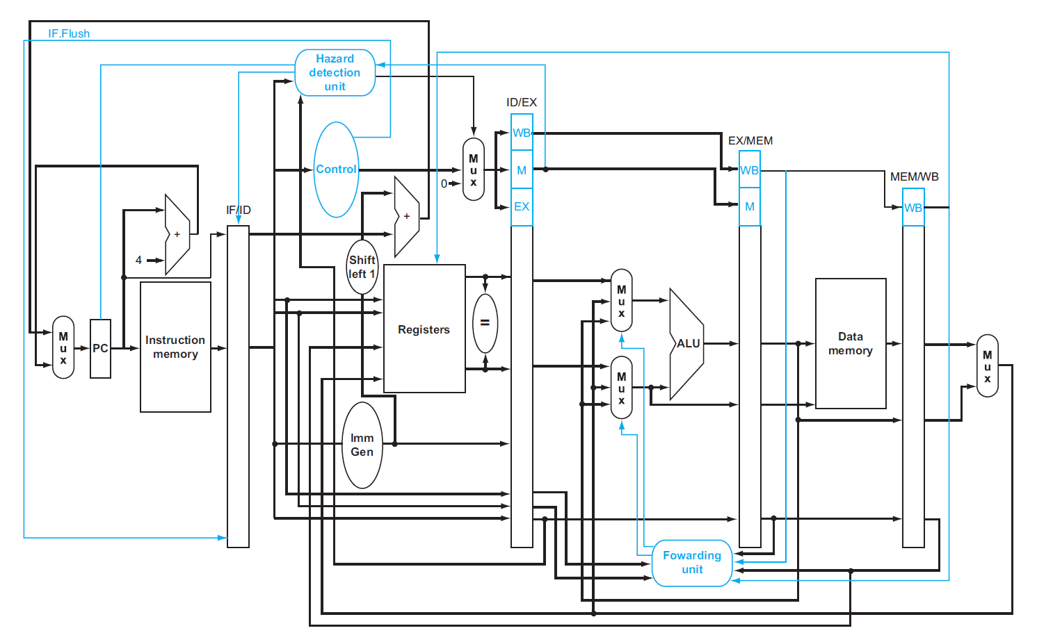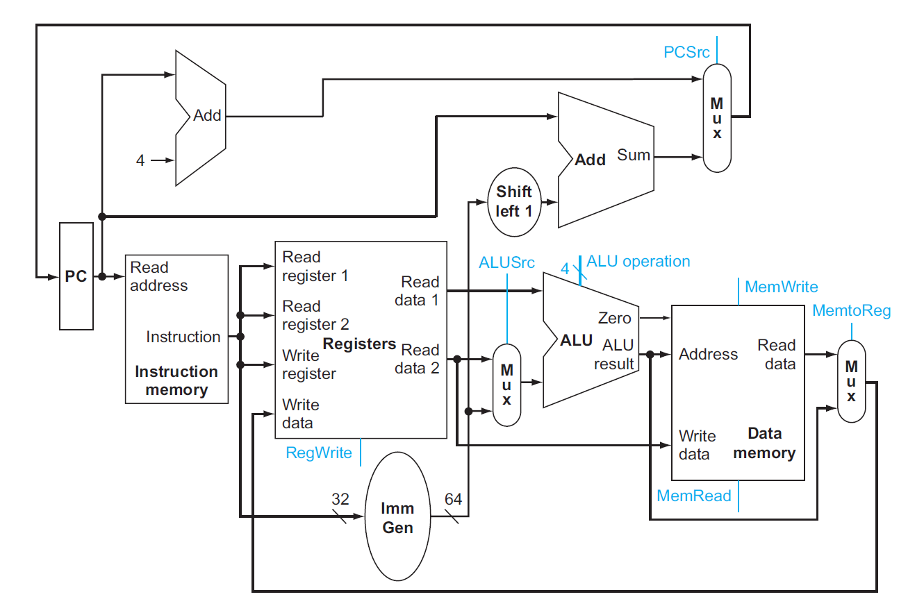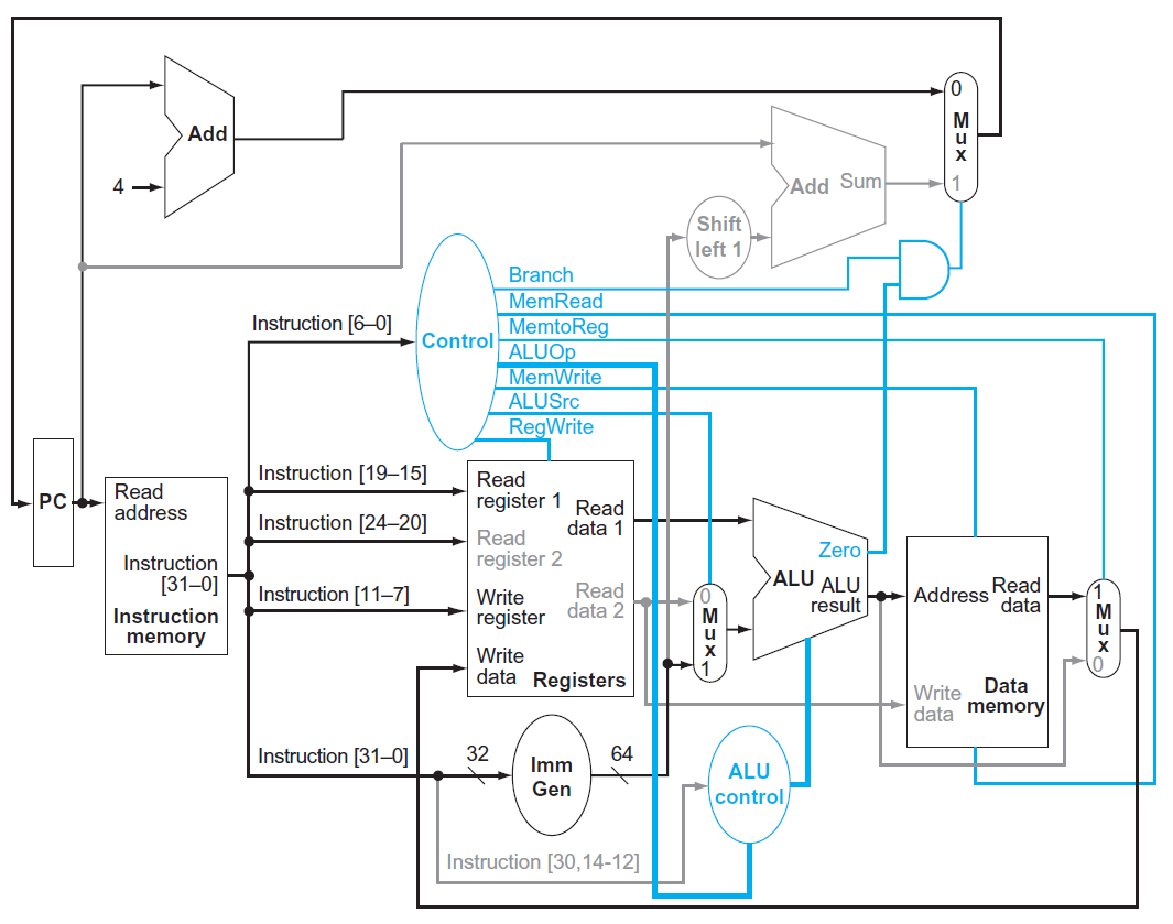 显然,一个输入端不可能同时接受两个来源的数据,因此需要由一个多路选择器(multiplexor, MUX),根据来自控制单元的控制信号(从指令中获取)去选择其中一个来源。下图展示了添加控制单元后的原理图: