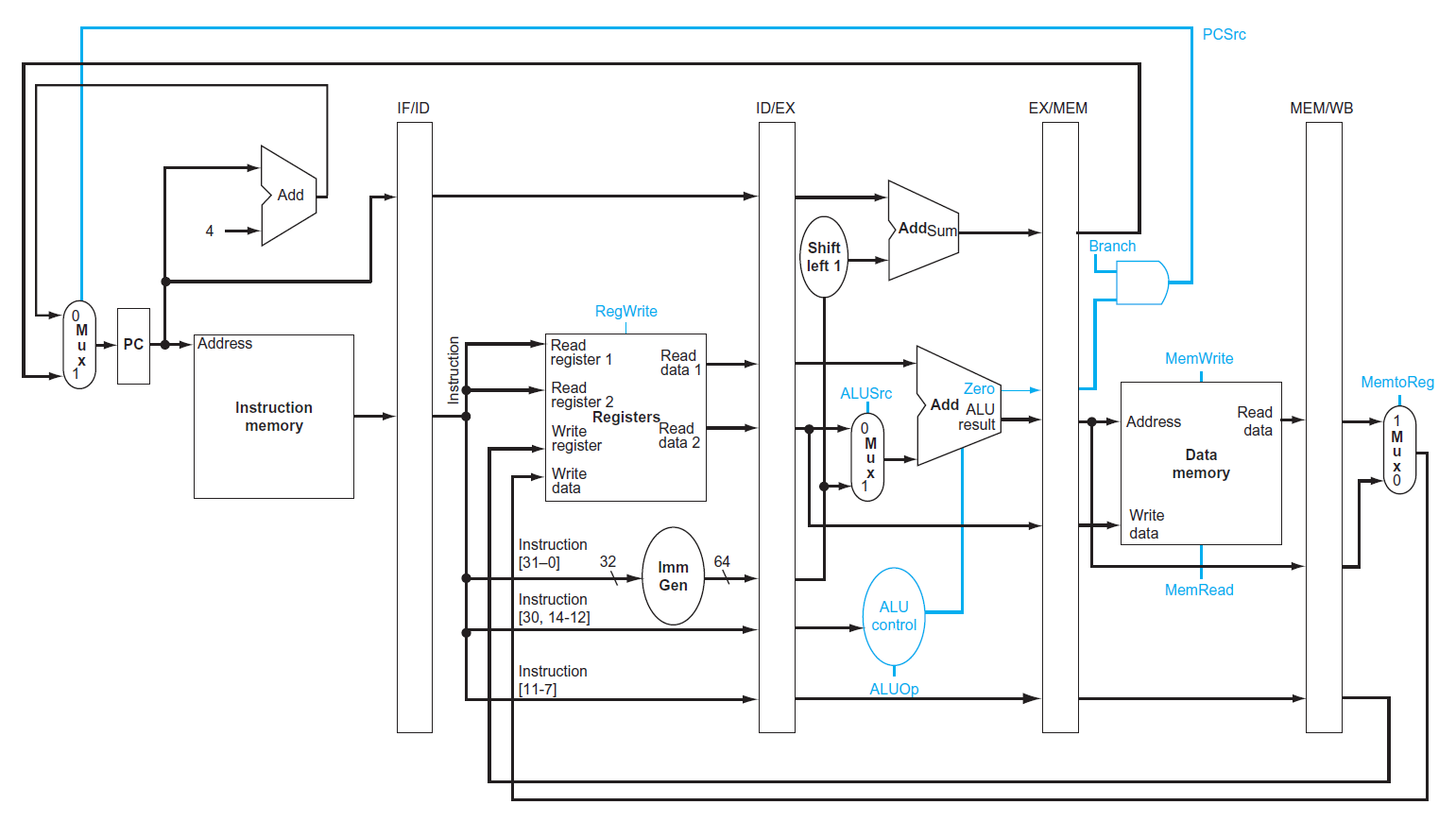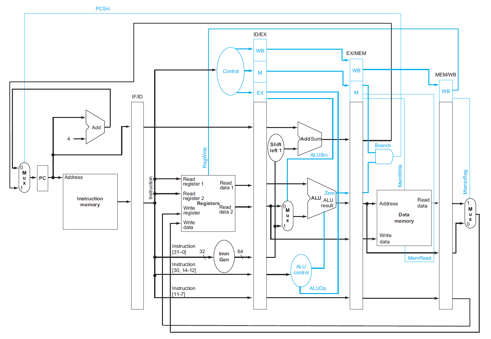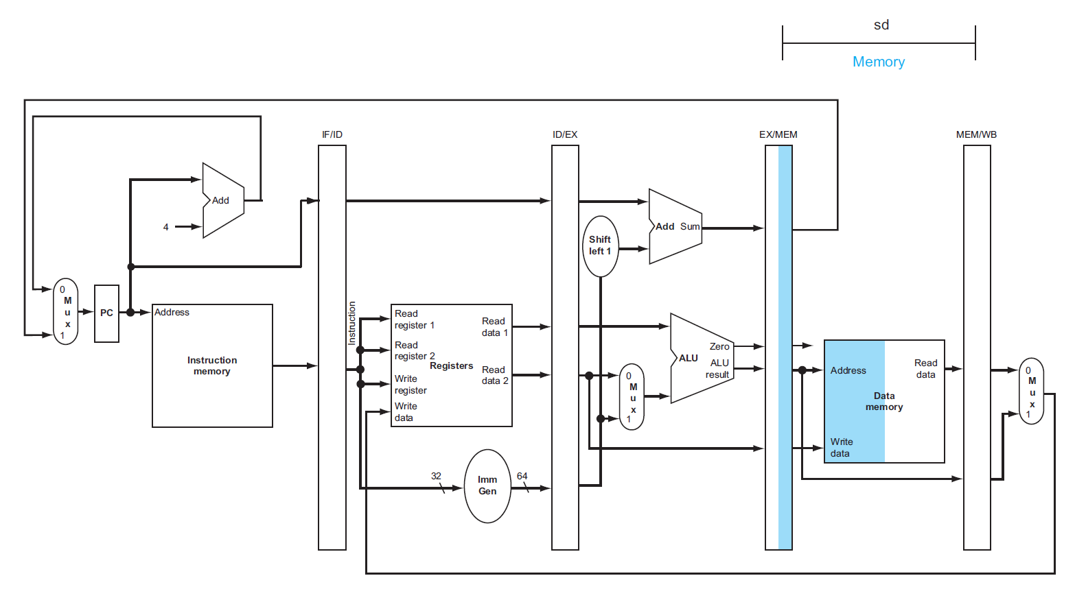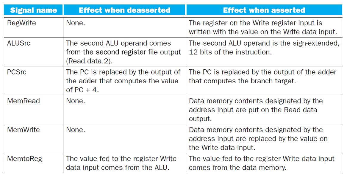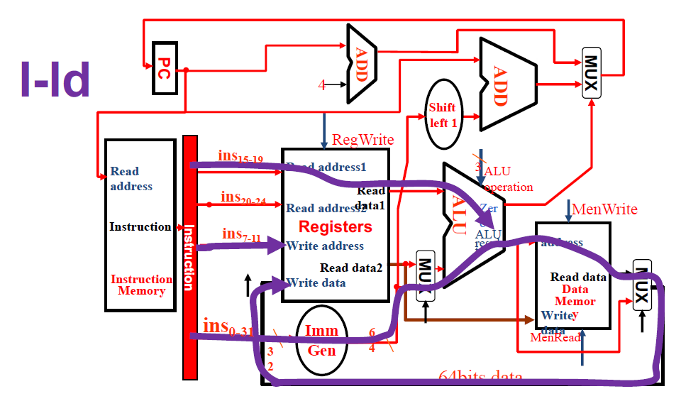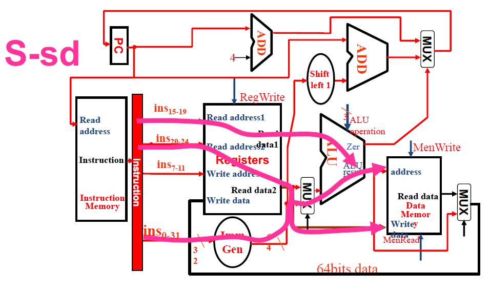 ld)和写(sd)的控制输入,分别为MemRead和MemWrite- 内存的读取需要控制信号的原因是:并不是所有指令都会有访存操作,而且访存耗时较长,所以那些用不到内存值的指令就不应该读取内存数据,因此需要控制信号来关闭这扇门;而所有指令都要从寄存器堆里读取数据,因此寄存器堆的读取无需控制信号