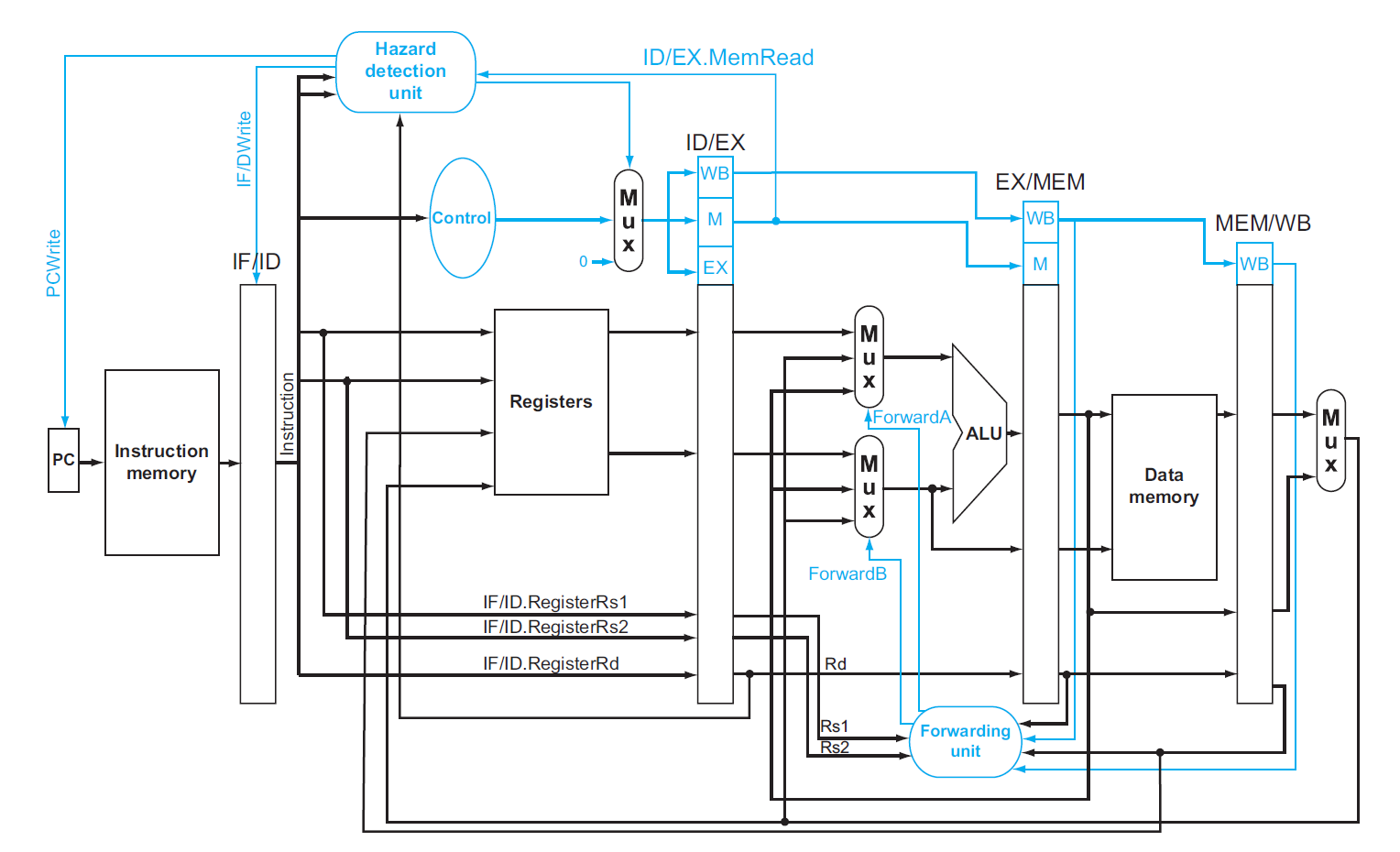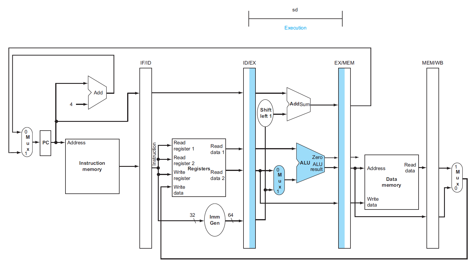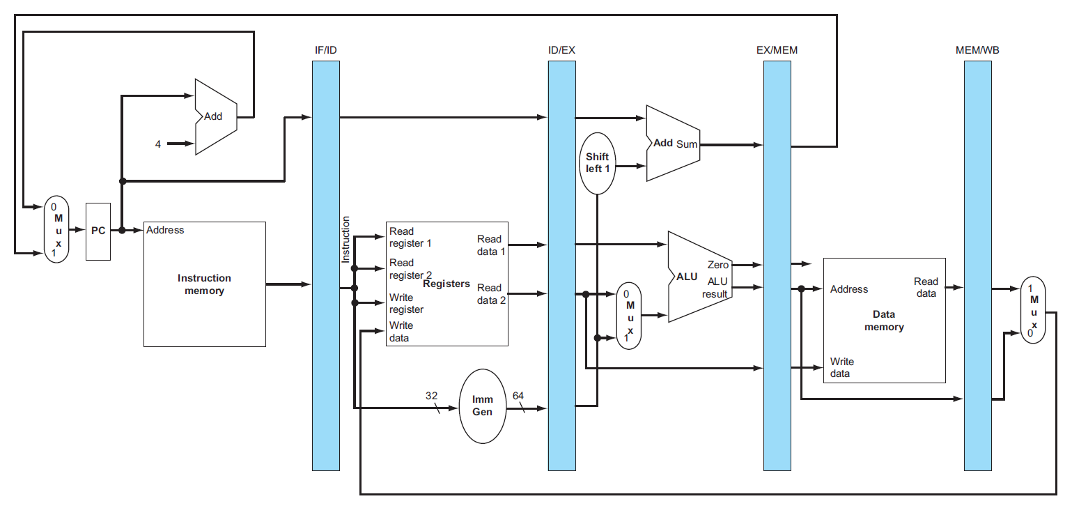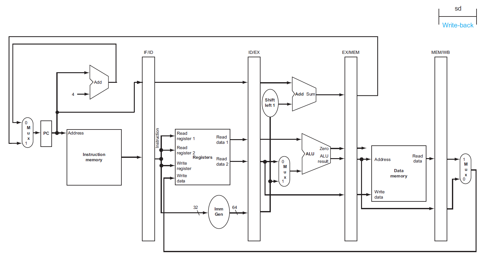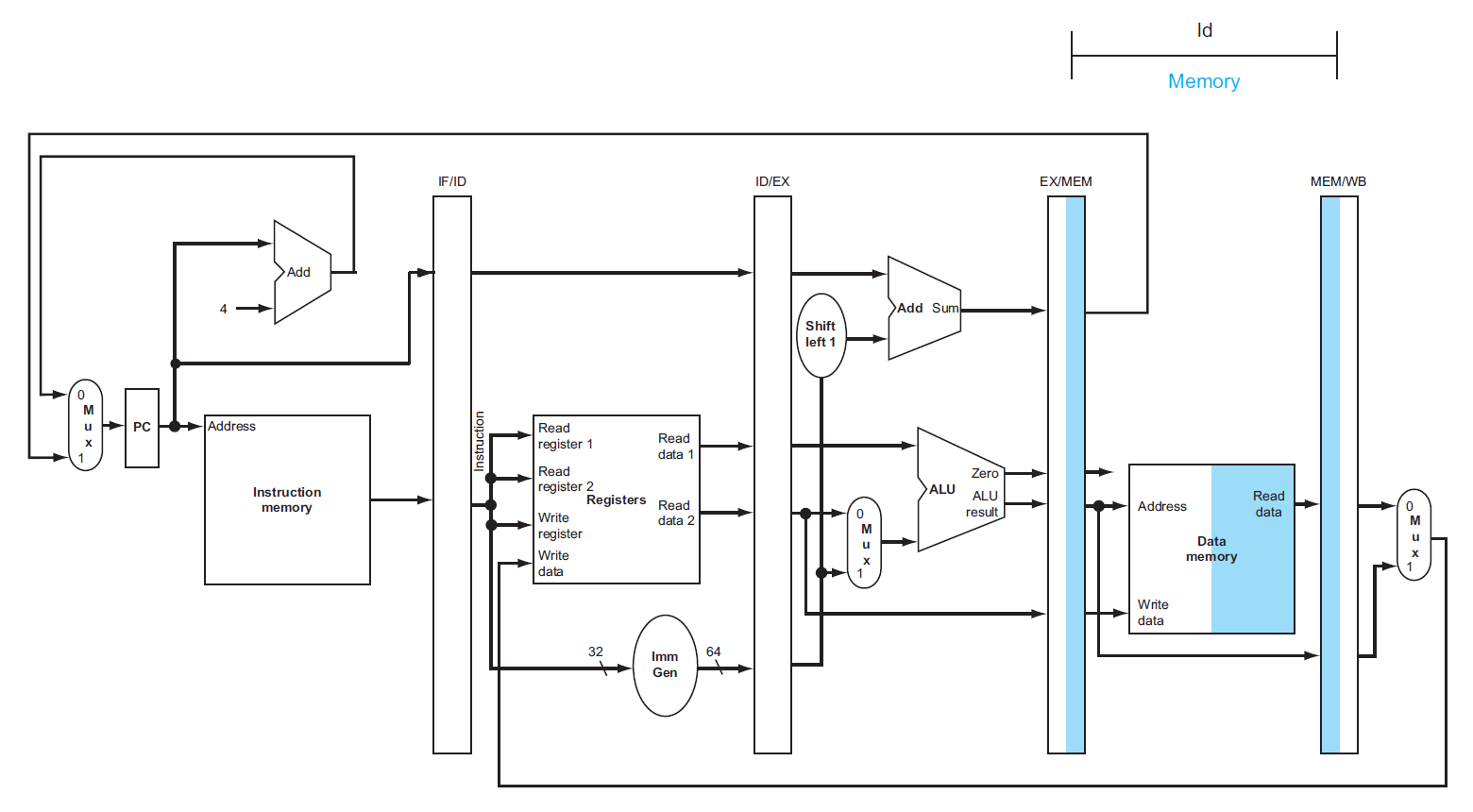 ld)和写(sd)的控制输入,分别为MemRead和MemWrite- 内存的读取需要控制信号的原因是:并不是所有指令都会有访存操作,而且访存耗时较长,所以那些用不到内存值的指令就不应该读取内存数据,因此需要控制信号来关闭这扇门;而所有指令都要从寄存器堆里读取数据,因此寄存器堆的读取无需控制信号
