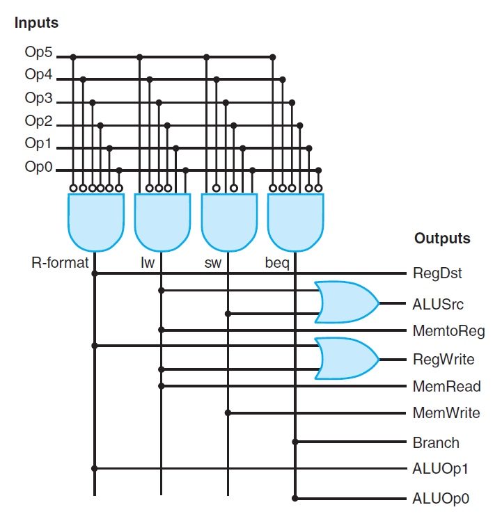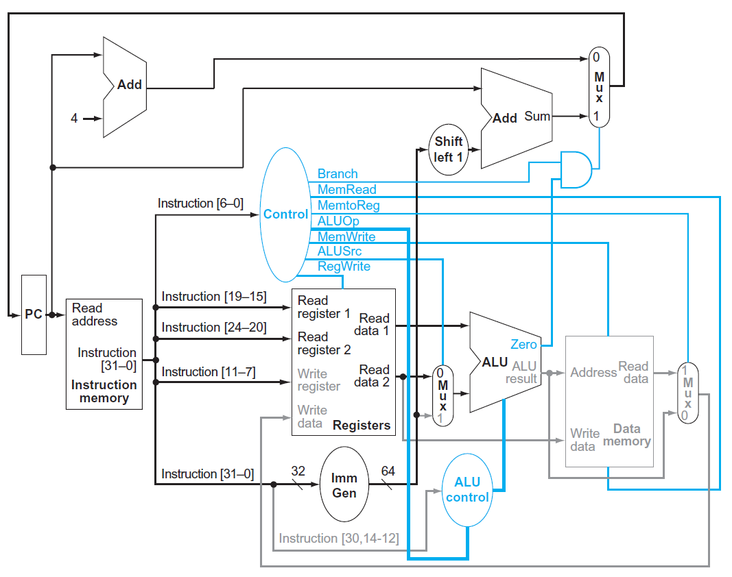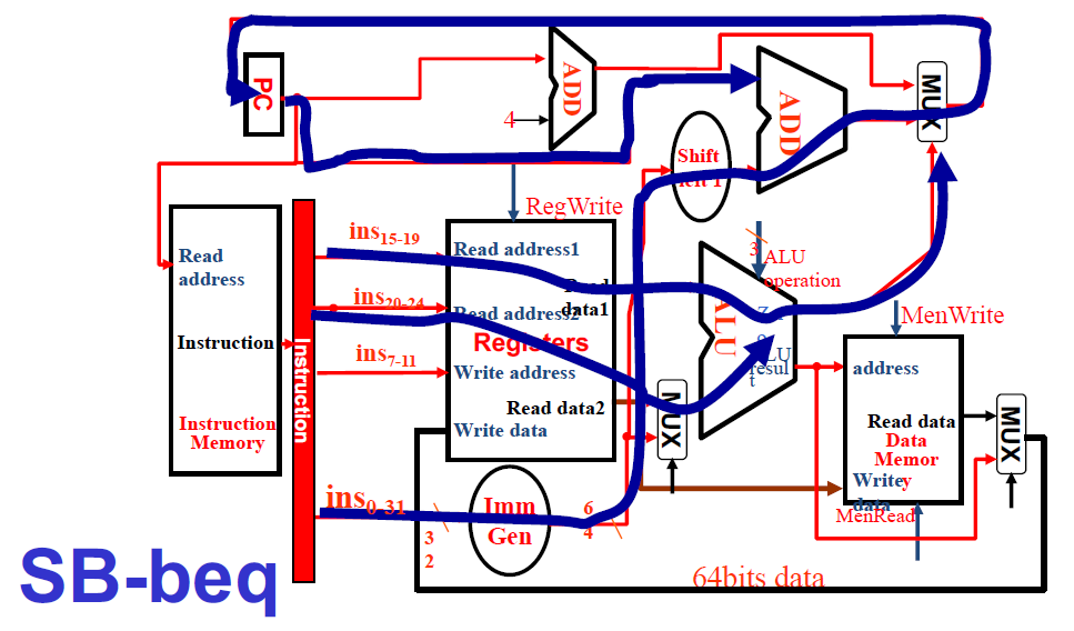 beq,只有当 ALU(减法)结果为 0(表明两数相等) ,且控制单元的信号Branch = 1时,PC 的值为指定的跳转地址 - 根据数逻的知识,我们可以将图中出现的元件归个类: