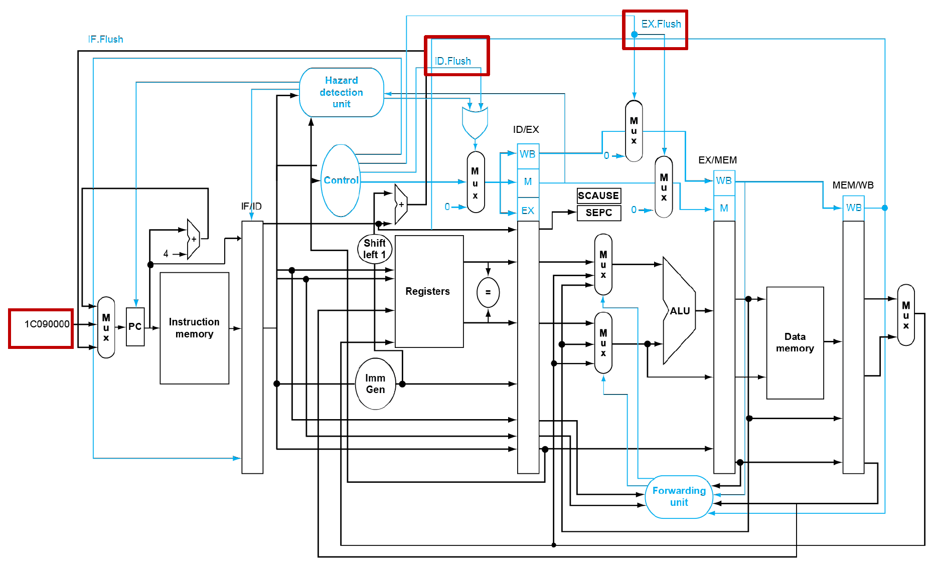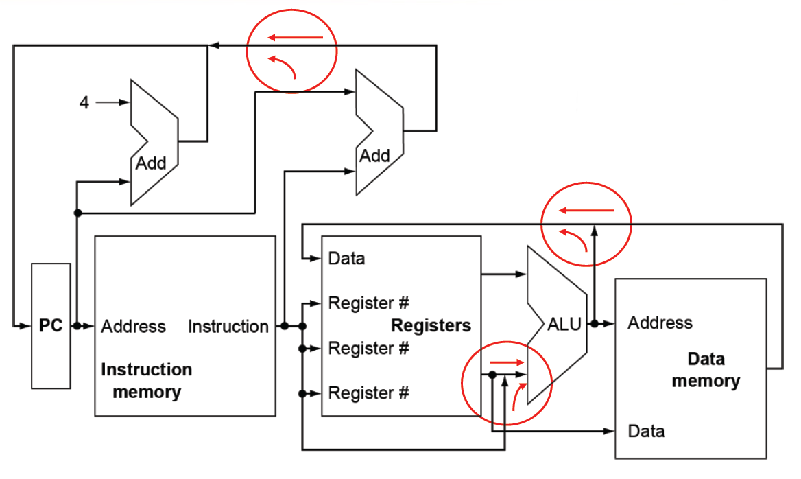 - 左上角:PC 的来源有两个:PC + 4(靠左的 Add)或者是由指令指定的地址(靠右的 Add)