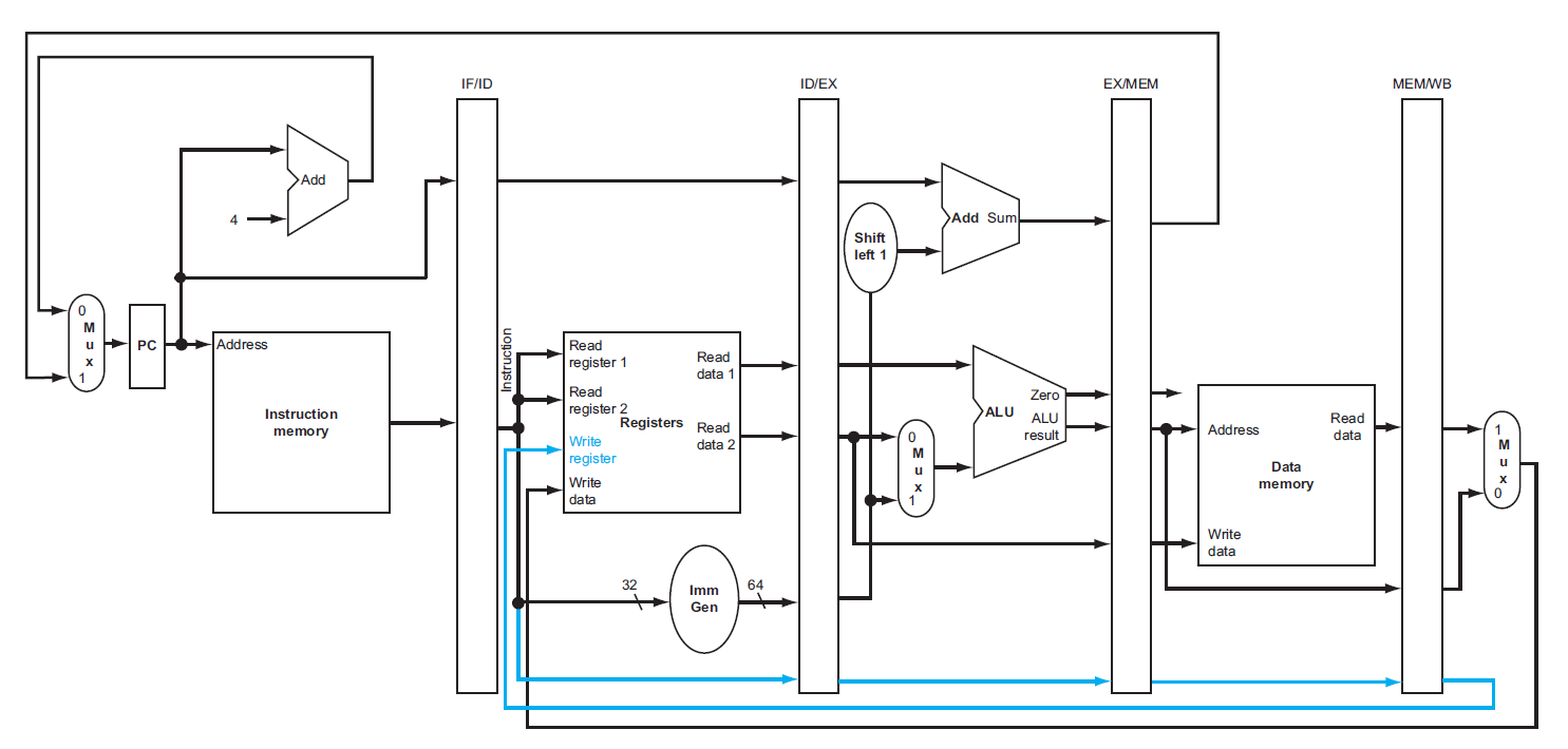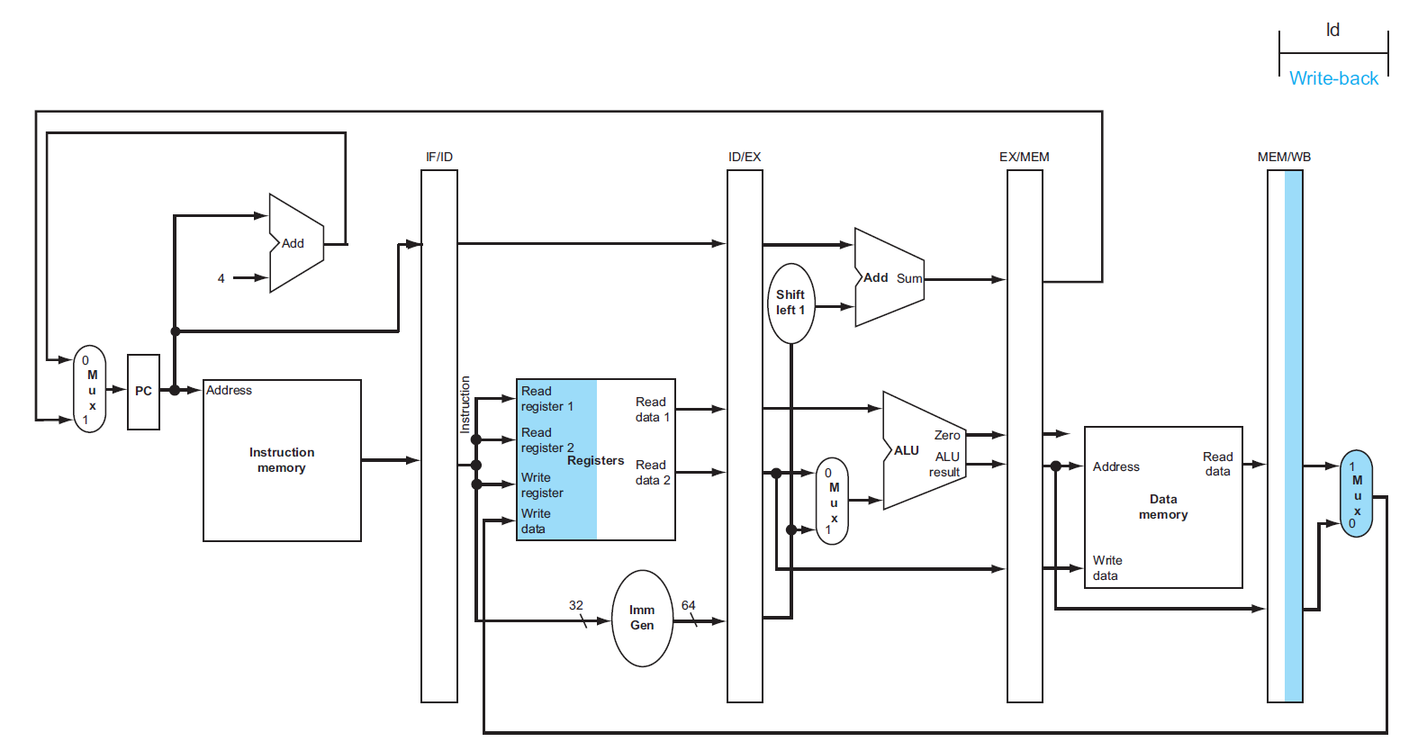 - 中间:写回寄存器的数据也有两个来源:ALU 的运算结果,或来自内存的值