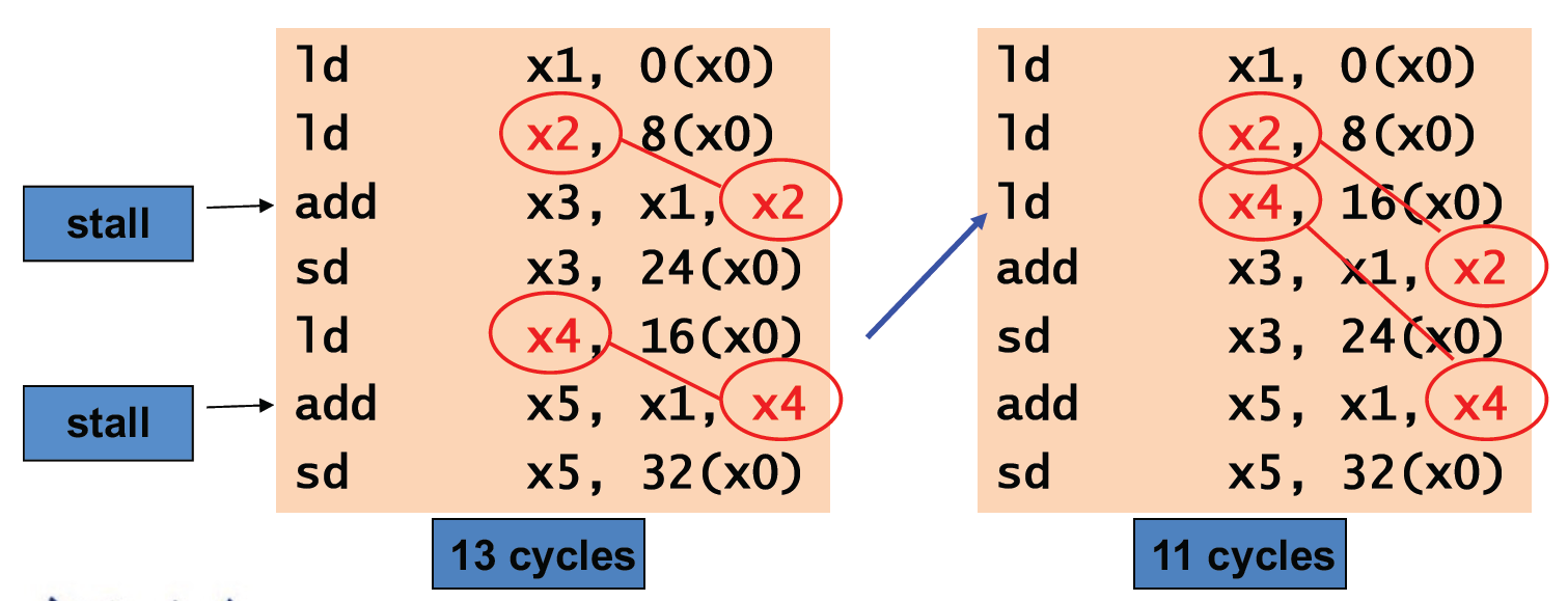 这里的sub指令可以随时执行;而add和ld指令之间存在依赖关系,add指令需要获取ld指令的数据,从而产生停顿。这时可以让sub提前执行,充分利用了停顿的时间。