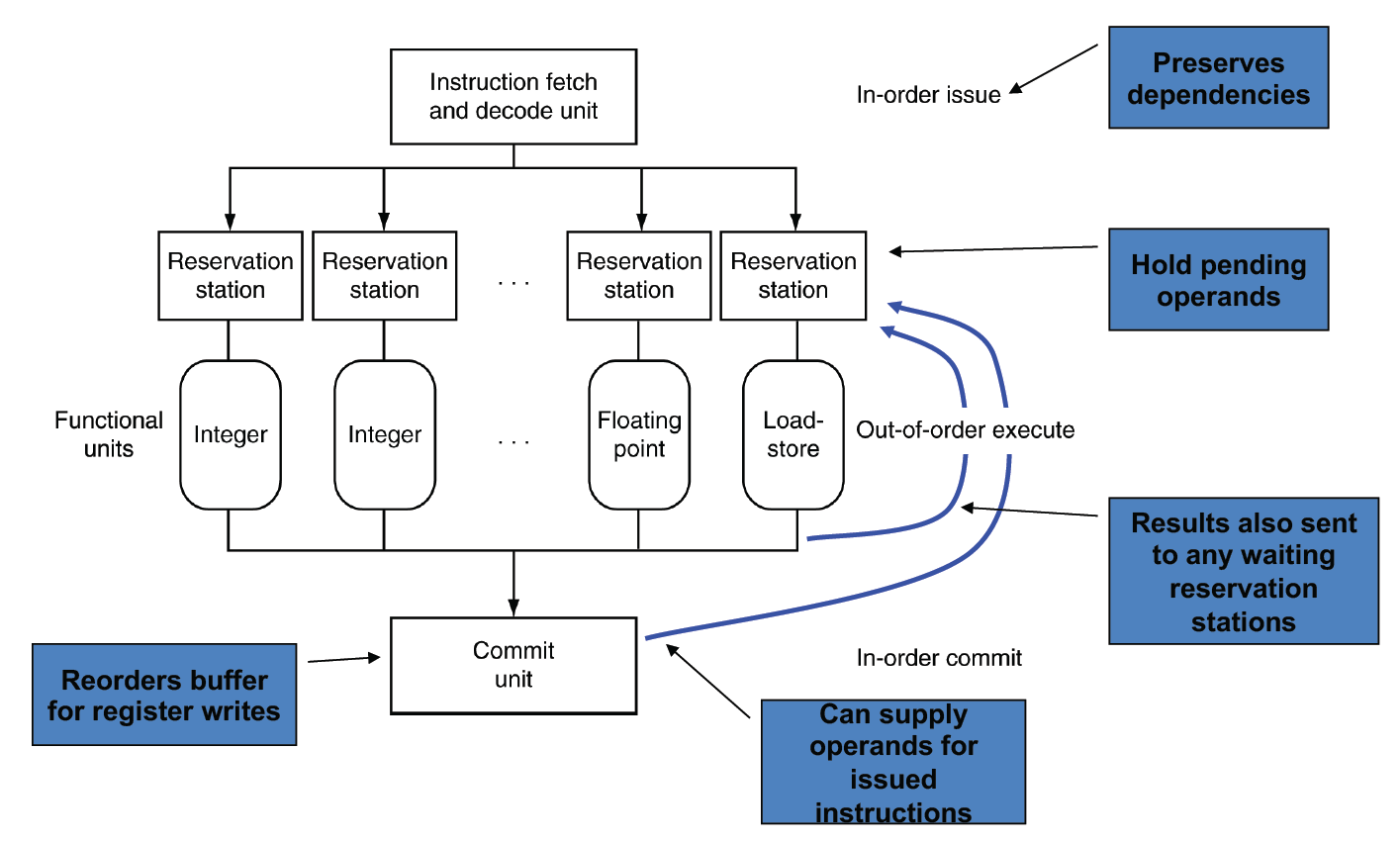 - 如果操作数不在寄存器堆或重排缓存中,那一定是在等待功能单元生成这个操作数,该功能单元的名字将会被追踪。当该单元生成结果后,该结果的拷贝会绕过寄存器,被直接放入保留区中。