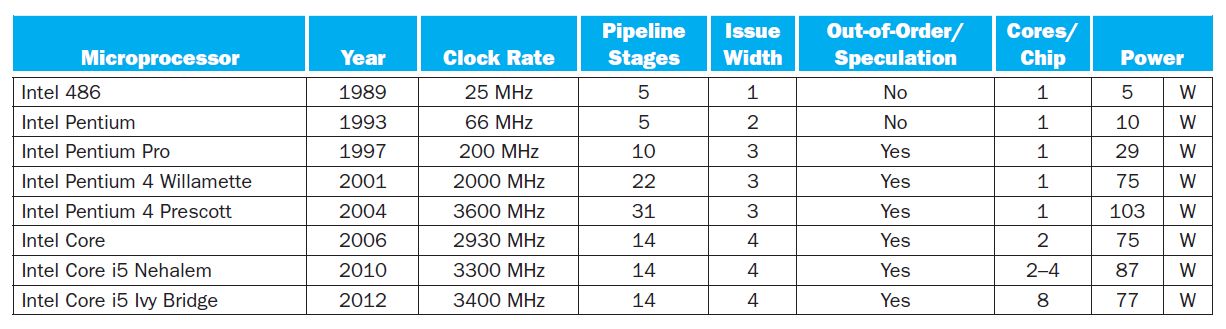 指令集并行的缺陷在于能效问题,因为要提升性能,就需要用到更多的晶体管,但这样通常会降低能效,与我们在第 1 章中提到的“能耗墙”发生冲突。下表展示了不同处理器的流水线复杂度、核的数量以及能耗的对比表格: