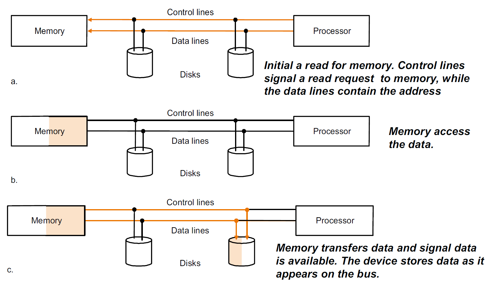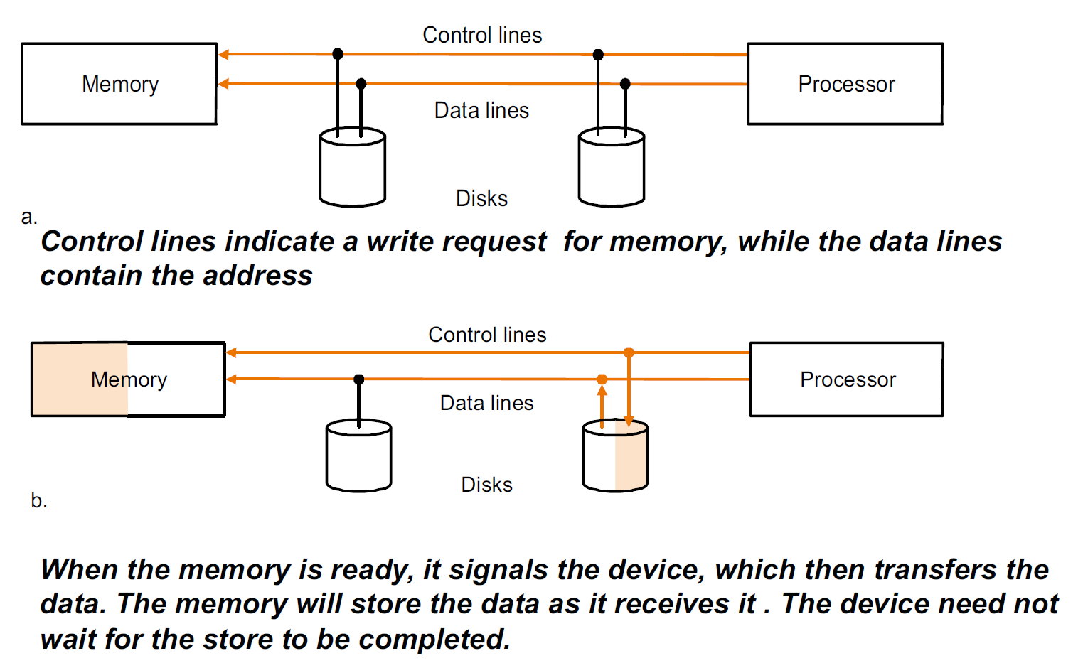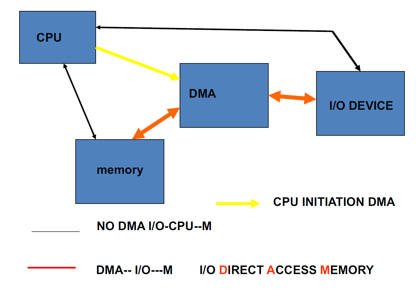 直接内存访问(direct memory access, DMA):设备控制器直接向 / 从内存传输数据,不需要处理器的介入