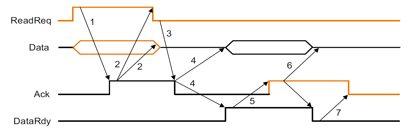 ReadReq处于低电平后,将Ack置于低电平状态 - 当内存完成数据读取后,它将数据放在数据线路上,并抬高