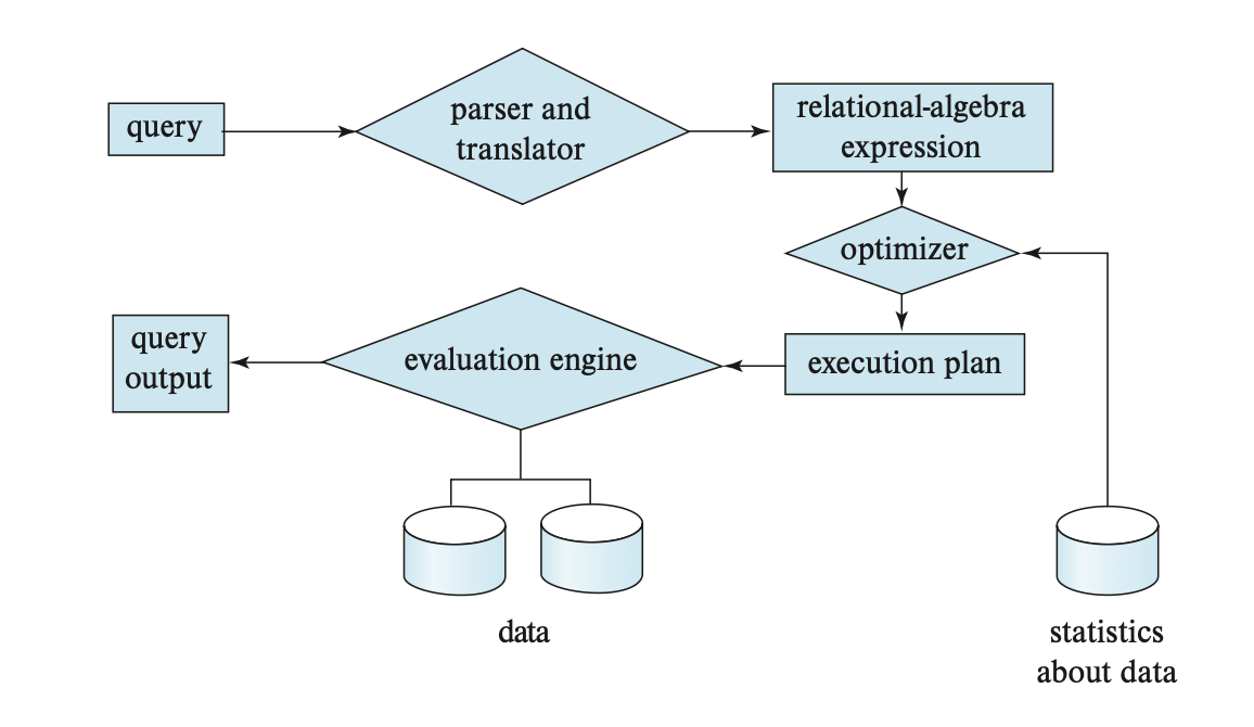 - 优化(optimization):系统负责构建最小化查询求值成本的查询求值计划,具体内容将在下一讲介绍。