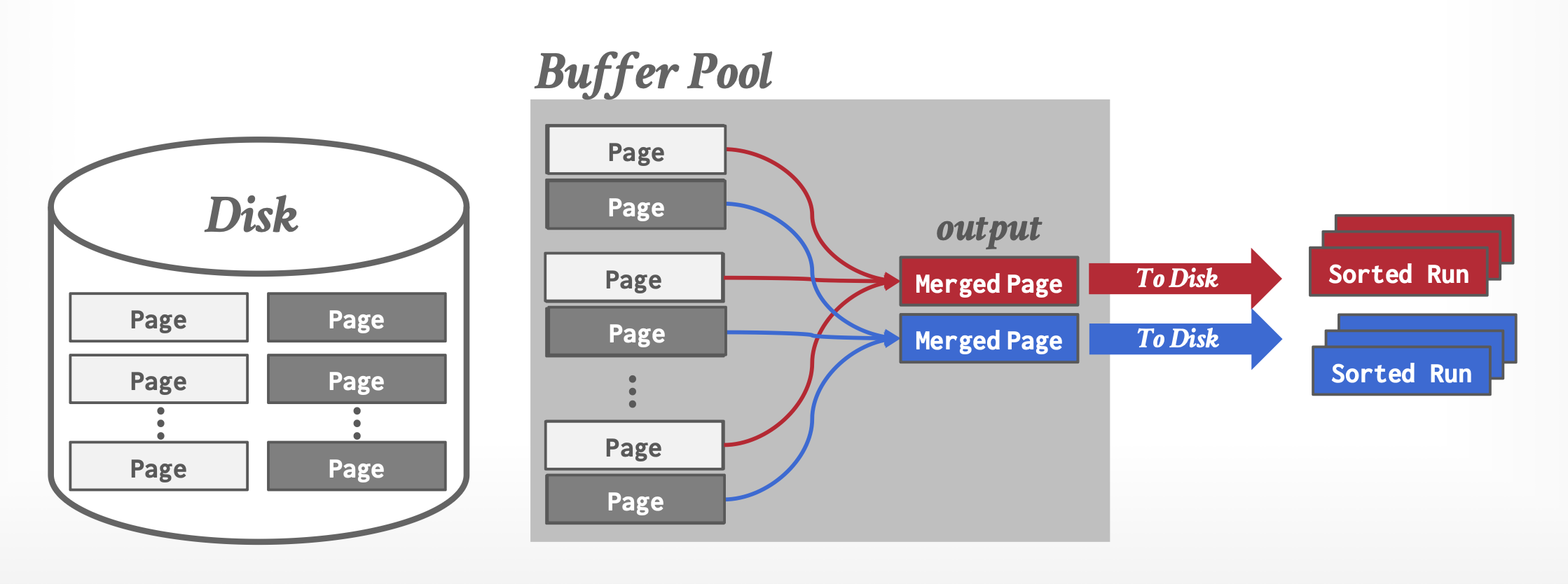 如果能用双缓冲区(double buffering)(使用两个缓存区,一个继续执行算法的同时,另一个将数据写入到磁盘中,从而做到 CPU 活动和 I/O 活动的并行)的话,能够使算法更加高效地执行。而寻道次数则可通过为输出缓存区分配额外的块来降低。