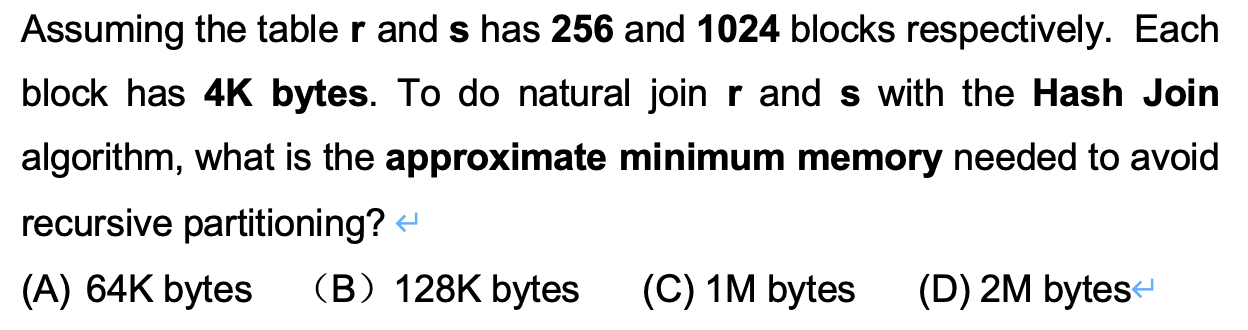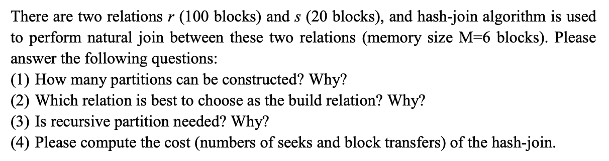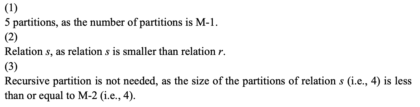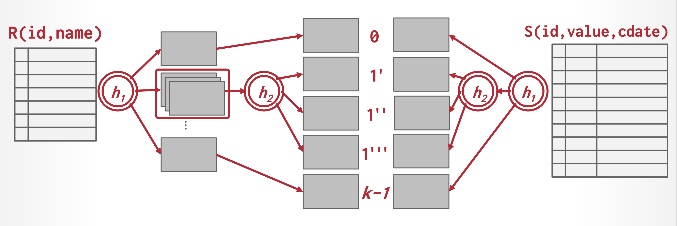 - 此时到达该点的 r, s 元组可以分别视为在分区 r0, s0 中。随后到达的 r, s 元组分别被分配到 r1, s1 分区,写入磁盘,并且不添加到内存索引中。