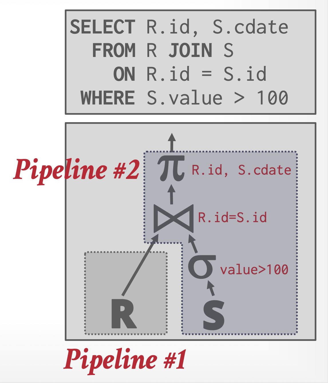查询计划可以被分区为众多子树,每个子树只有流水线化的边,而子树之间的边是非流水线化的边。这些子树被称为流水线阶段(pipeline stage)。查询处理器一次执行一个流水线阶段,并发执行单个流水线阶段中的所有操作。