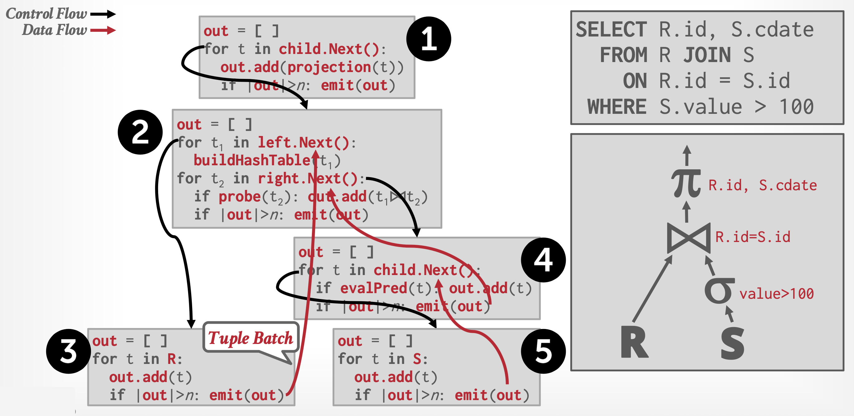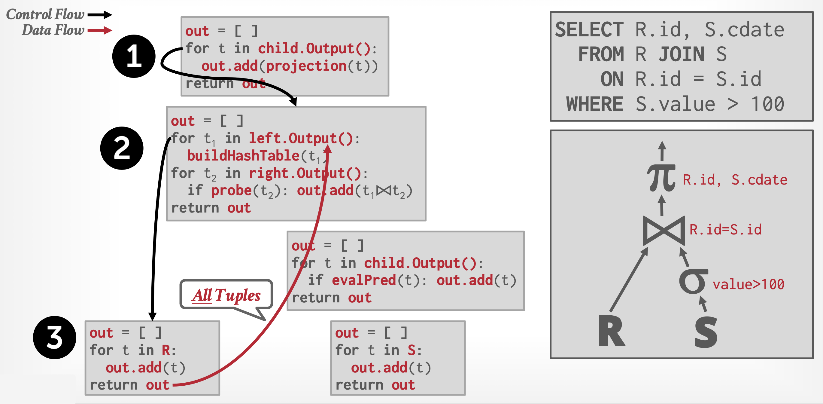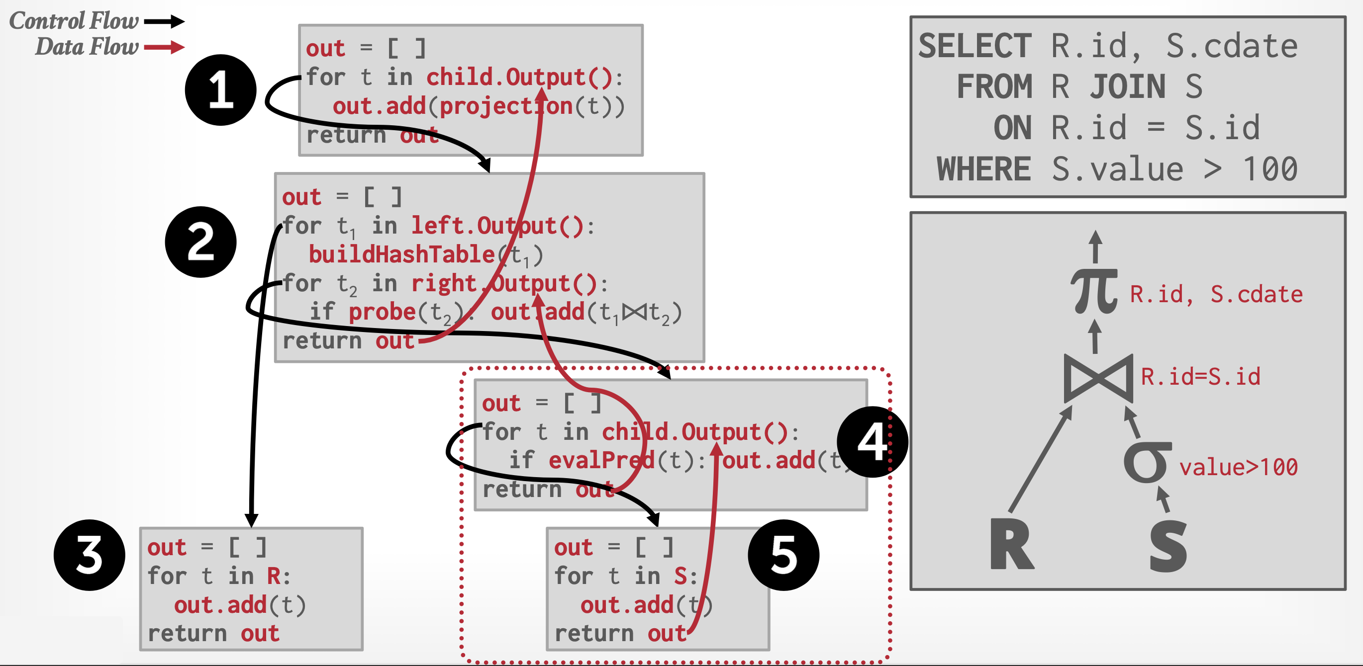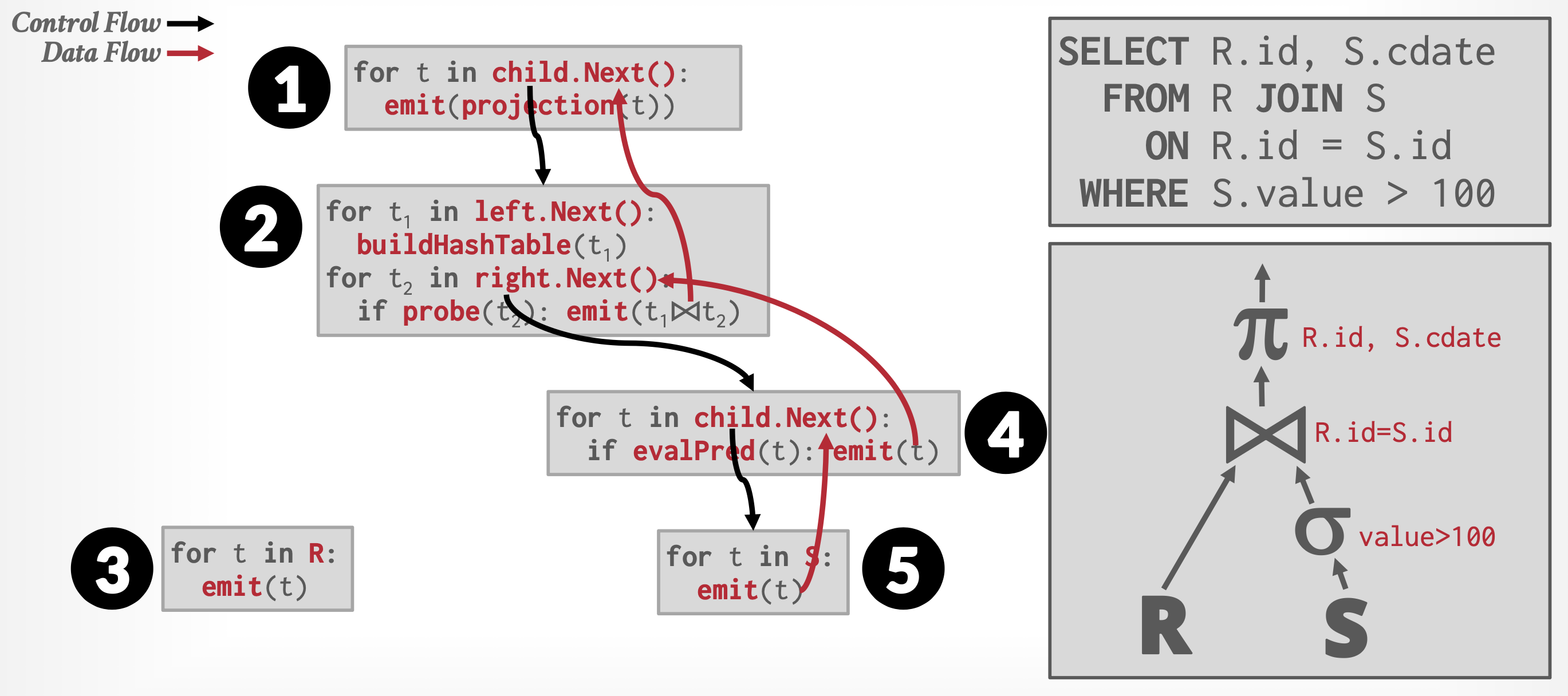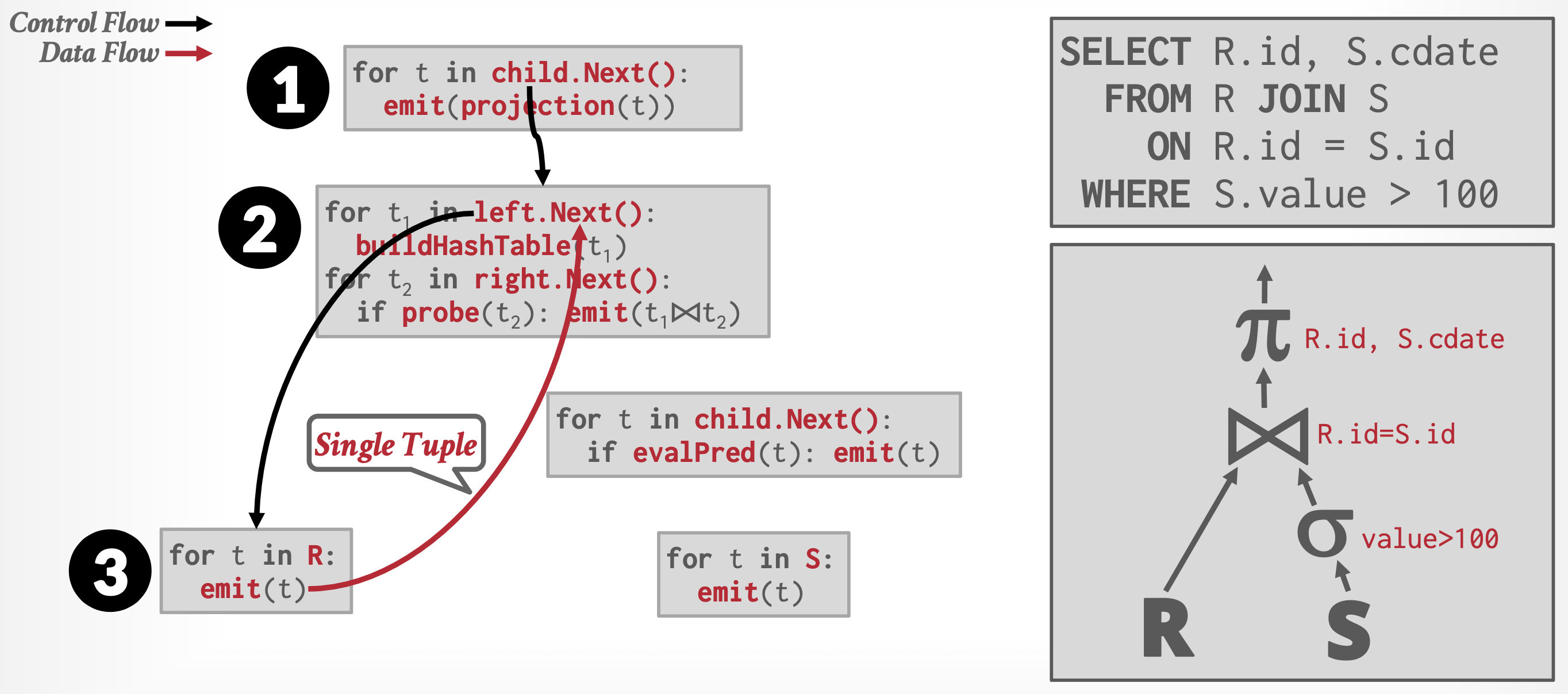 - 控制流(control flow):决定了数据库管理系统如何调用运算符