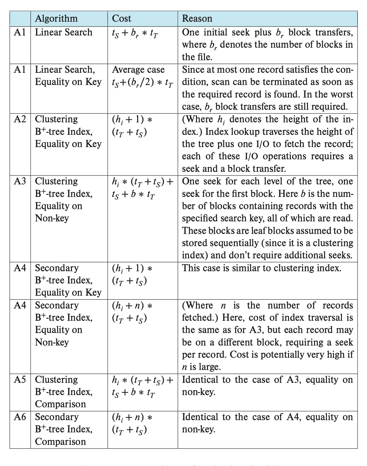 - 在估计查询求值计划的成本时,我们用块传输个数(number of blocks transfer) 和随机 I/O 访问次数(number of random I/O accesses)(对应磁盘寻道次数)这两个因素来衡量。我们用 \(t_T, t_S\) 分别表示传输一个数据块的平均时间和平均块访问时间(磁盘寻道时间 + 旋转时延