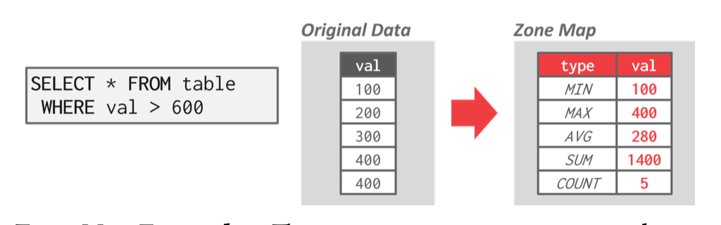 ) :预计算页中每个元组属性的聚合值,这样 DBMS 可以通过首先检查其区域映射来决定是否需要访问某个页。- 各页的区域映射存储于独立的页中,且每个区域映射页通常包含多个条目,因此这种方法能够减少顺序扫描过程中需要检查的页面总数
