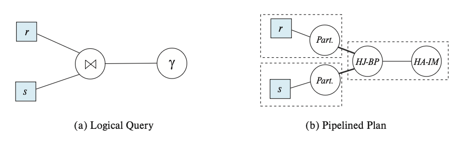 下面给出两张图:左图展示了一个连接两个关系 r, s 的查询,然后对结果进行聚合;右图展示了使用哈希连接和内存哈希聚合的查询流水线计划。