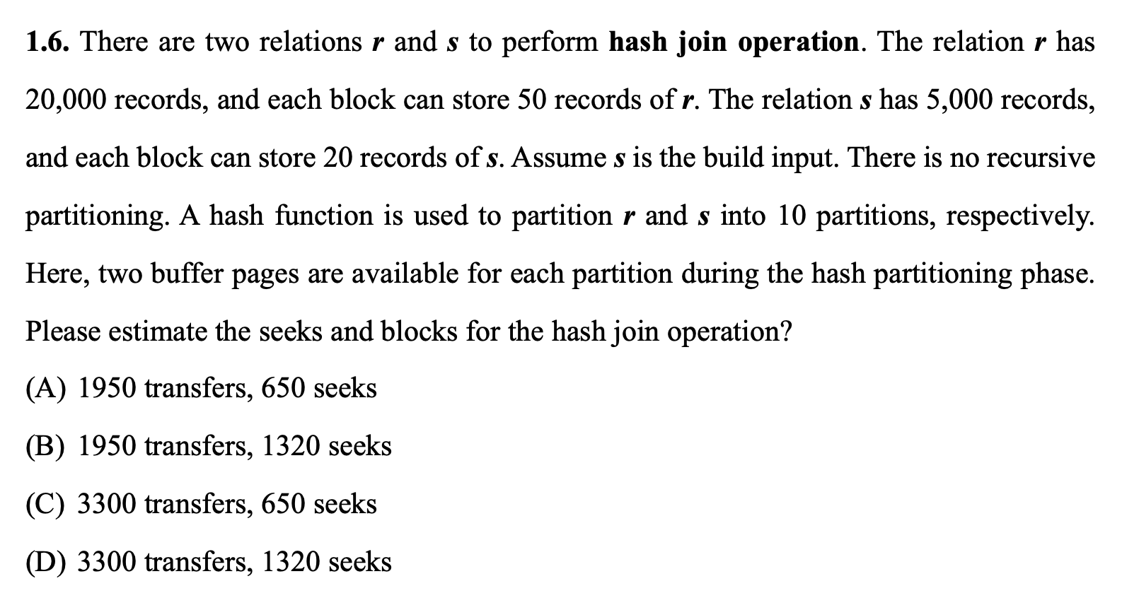 ) 。所以,假如某个运算需要传输 \(b\) 个数据块和 \(S\) 次随机 I/O 访问,那么所需时间为 \(b \cdot t_T + S \cdot t_S\) - 虽然 SSD 不用考虑寻道时间,但是它发起 I/O 运算时也需要一定时间,因此我们将发起 I/O 请求到数据的第一个字节返回这段时间设为 \(t_S\)