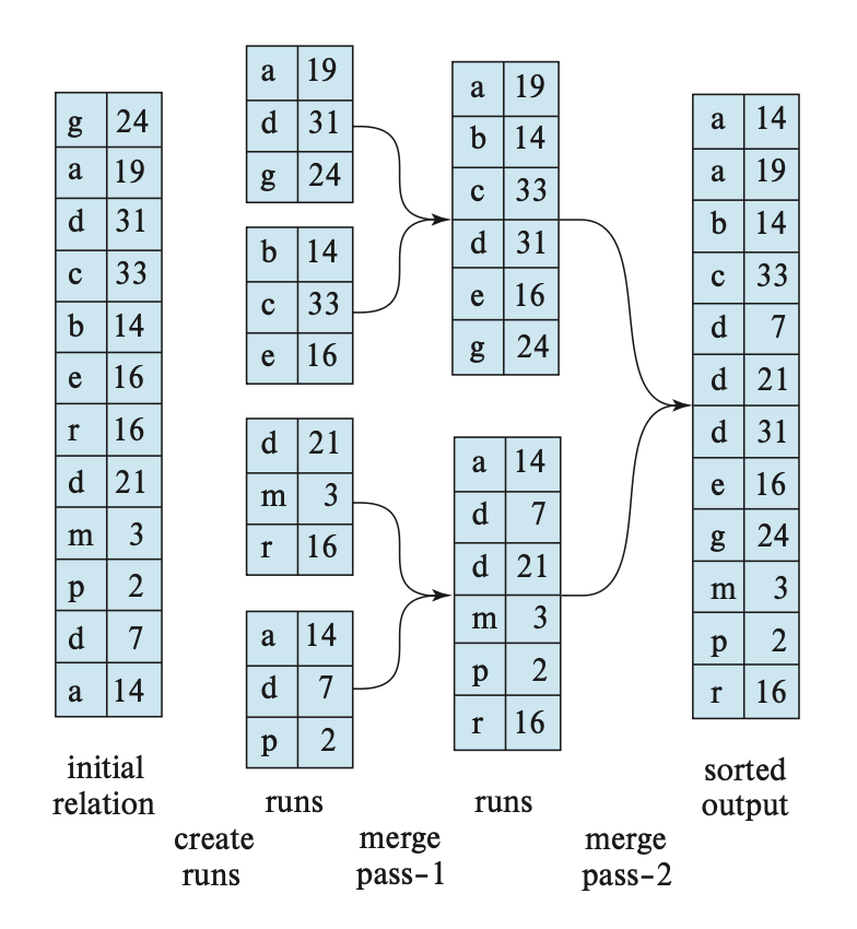 - 算法的成本取决于主存缓冲区的大小。在最好情况下,缓冲区容得下所有数据,此时无需再次访问磁盘了;在最坏情况下,缓冲区只容得下部分数据块