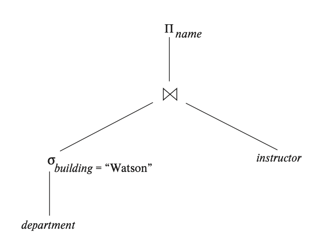 最易于直观理解如何对一个表达式求值的方式是观察该表达式在运算符树(operator tree) 上的图画表示。比如对于表达式 \(\Pi_{name}(\sigma_{building="Watson"}(department) \bowtie instructor)\),它的运算符树如下所示: