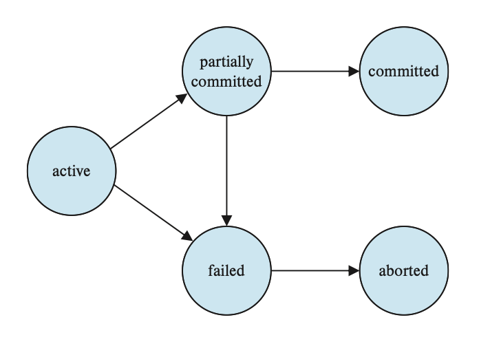 - 中止(aborted):当事务已被回滚,且数据库将状态恢复至该事务执行前的状态