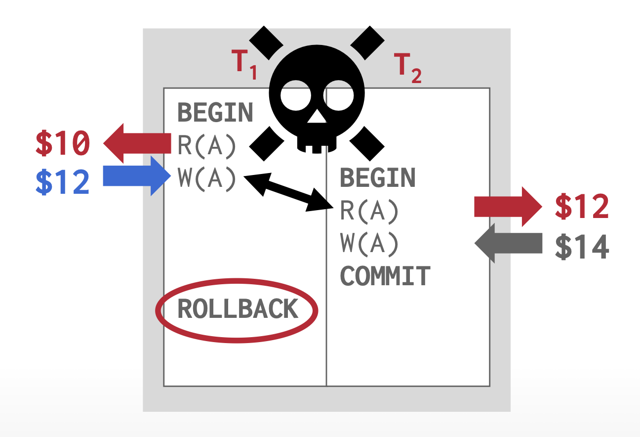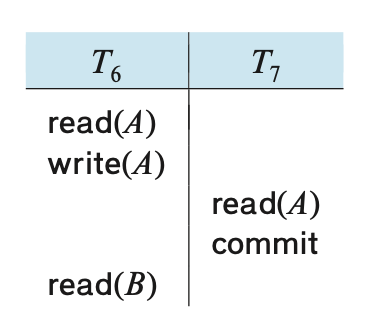 假如 \(T_6\) 在提交发生前故障,由于 \(T_7\) 依赖于(dependent) \(T_6\)(\(T_7\) 读取 \(T_6\) 的写入值