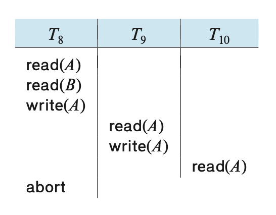 即便调度是可恢复的,要想正确地从故障中恢复事务 \(T_i\),我们可能需要回滚多个事务,这种情况发生于有其他事务读取被 \(T_i\) 写入的数据的时候。像这种单个事务故障导致一系列事务回滚的现象被称为级联回滚(cascading rollback)。比如对于下面的调度,如果 \(T_8\) 发生故障,就需要级联回滚了: