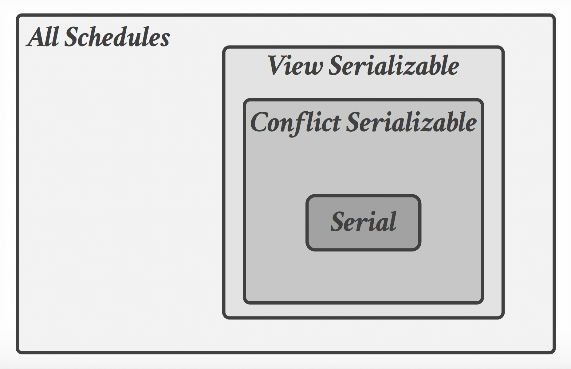 - 一种解决方法是干脆让这些事务串行执行,但这样的话相比并发执行性能太拉胯了,所以实际的解决方案还是确保并发执行,但能够确保并发执行事务的结果和等价的按照时间顺序执行事务的结果是一样的