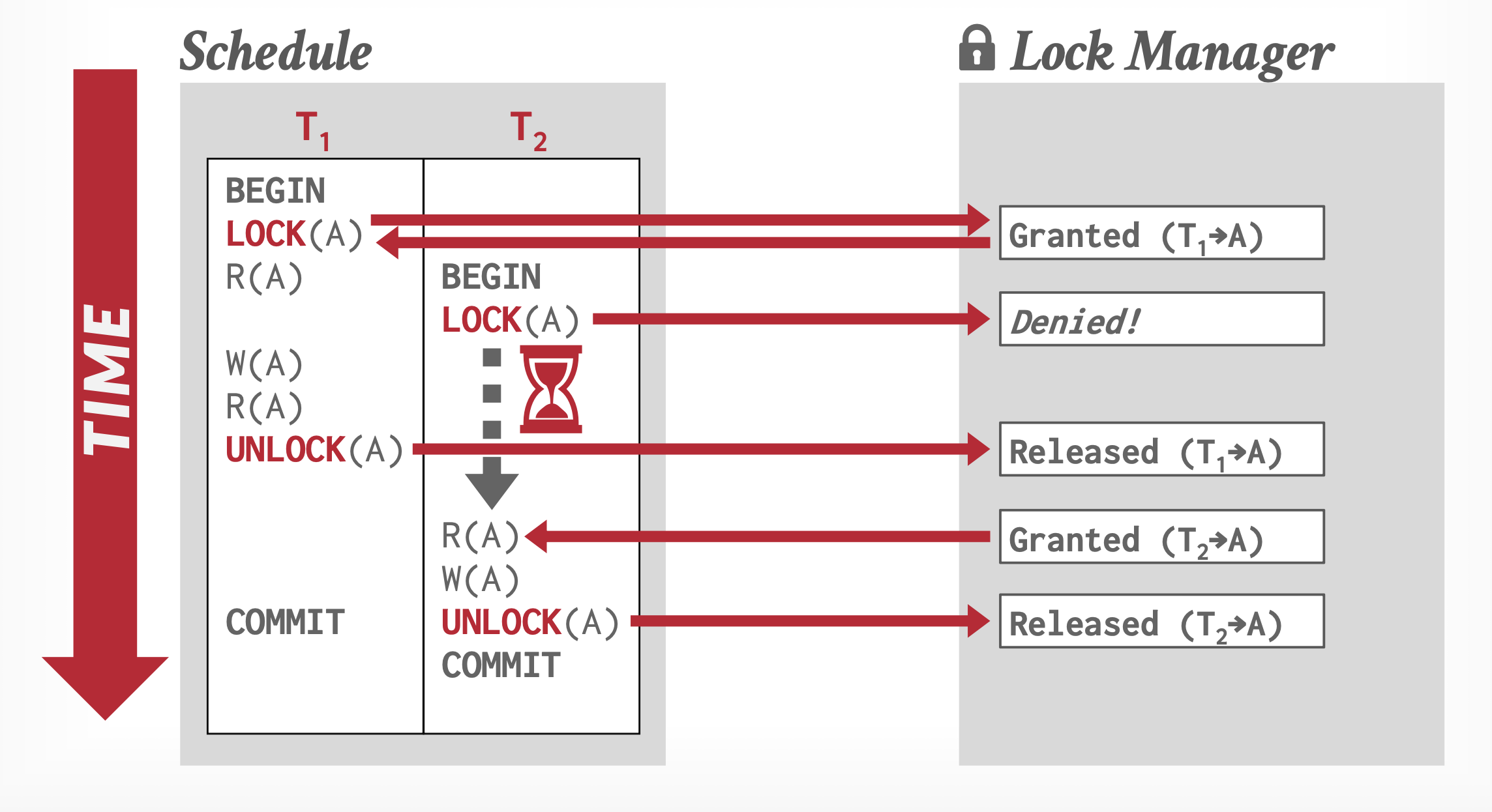 这里的锁机制类似数据库缓冲区的锁,但用法不太一样——事务会锁住那些它会访问的数据项,而锁住的时间应该足够长,以确保可串行性;但又不能过长,否则会过分损害系统性能。
