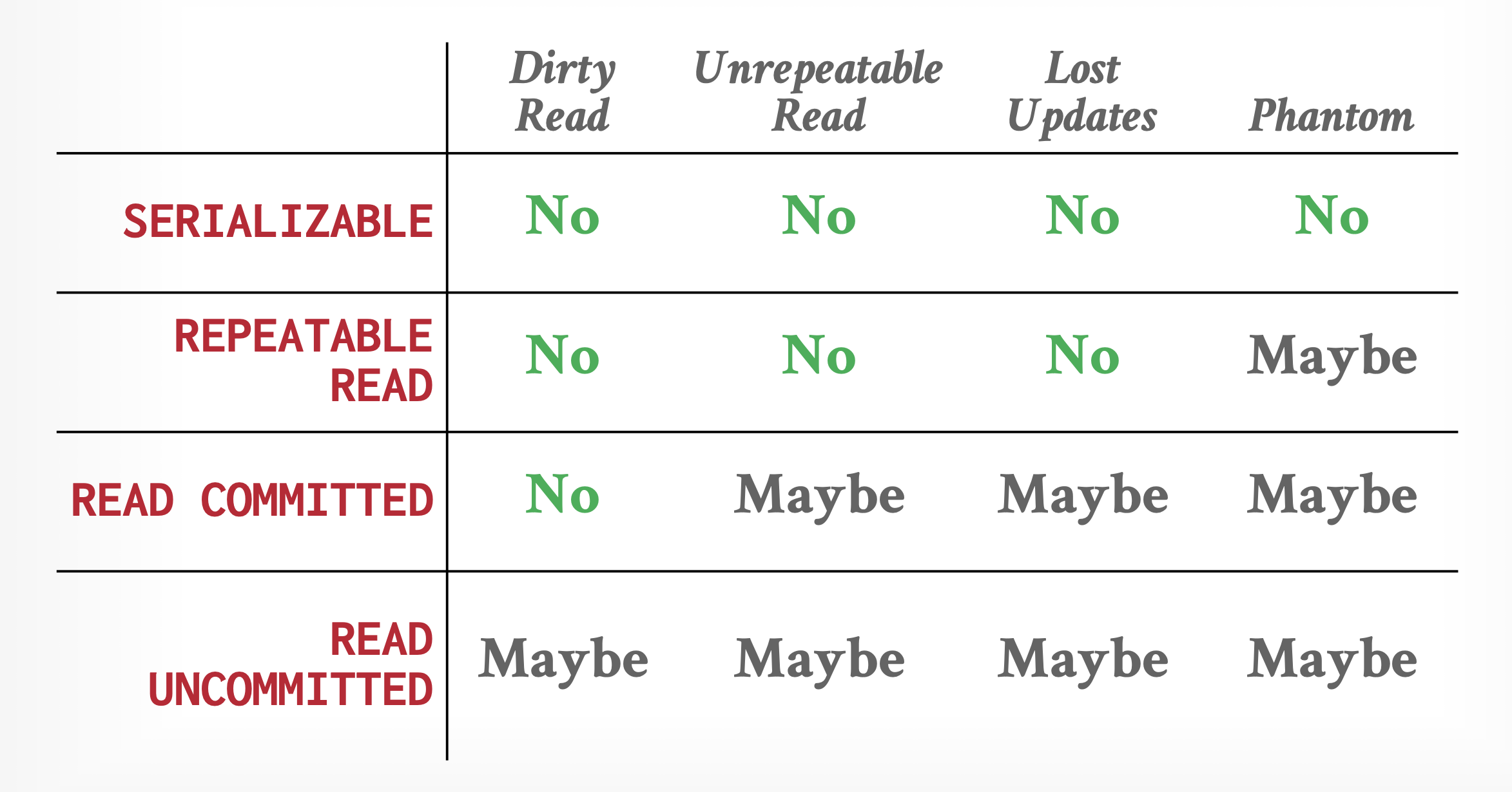 - 可串行化(serializable):通常能确保可串行化执行,但有些数据库系统在实现这个隔离等级时,会允许一些不可串行化的执行