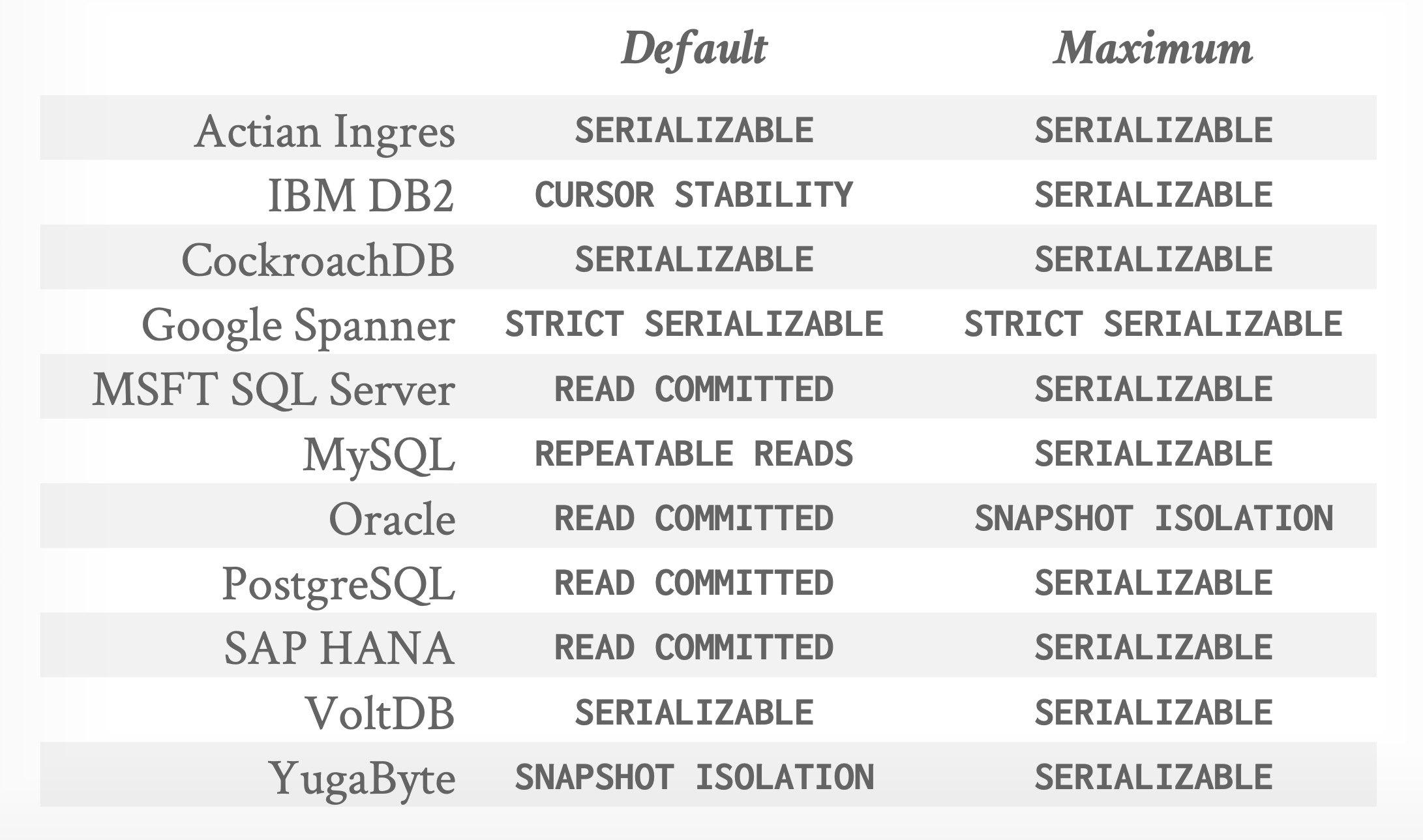 许多数据库系统默认运行在读取提交等级上,但我们也可以手动设置隔离等级。