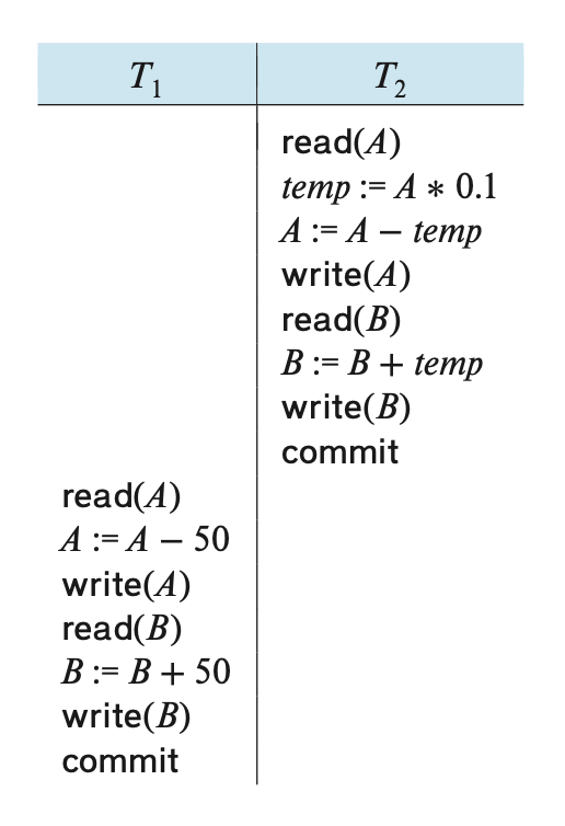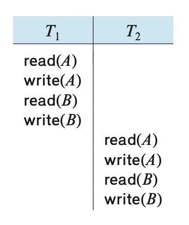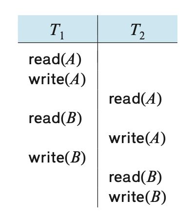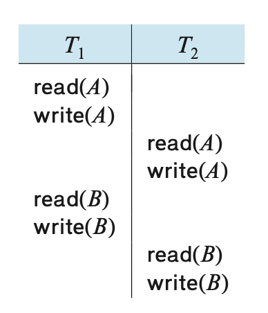 像这样的执行序列被称为调度(schedules),表示指令在系统中执行的时间顺序。一组事务的调度必须由所有来自这些事务中的指令构成,并且必须保留指令在各自事务中的出现顺序。上述的调度都是串行的(serial),因为不同事务的运算没有发生交错。假如有 n 个事务,那么就存在 n! 个不同的合法串行调度。