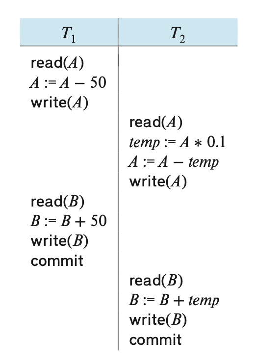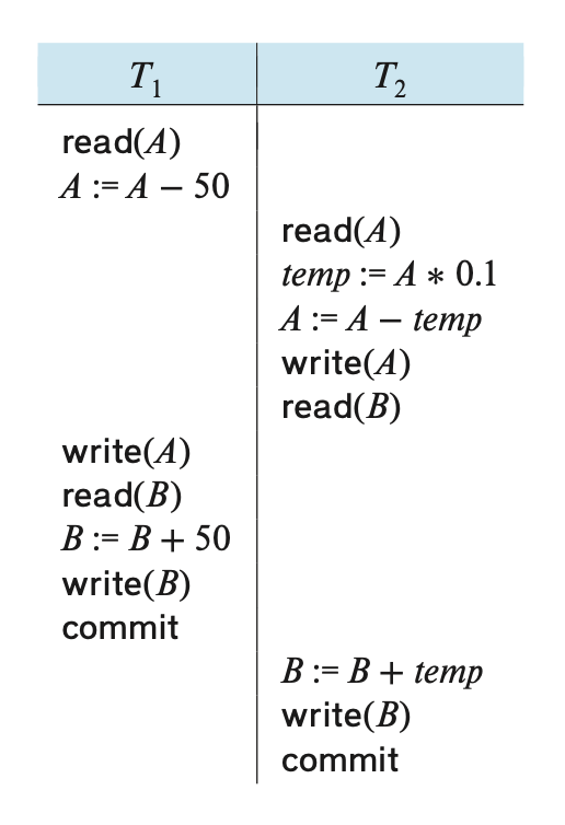 该调度得到的最终状态是不一致的,因为可以发现账户 A, B 的金额之和比原来的多出 $50。如果仅让操作系统控制并发执行的话,那么很多可能的调度都会出现不一致的状态。因此需要数据库系统来确保执行调度仍能保留数据库的一致状态。