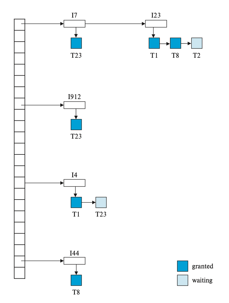 - 对于当前每个被锁住的数据项,维护一个记录链表,每个项为一次请求,遵循请求到达的顺序