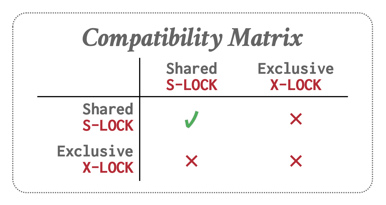 - 共享(shared):若事务 \(T_i\) 获得一个对于数据项 \(Q\) 的共享锁(shared-mode lock)(记作 \(S\)