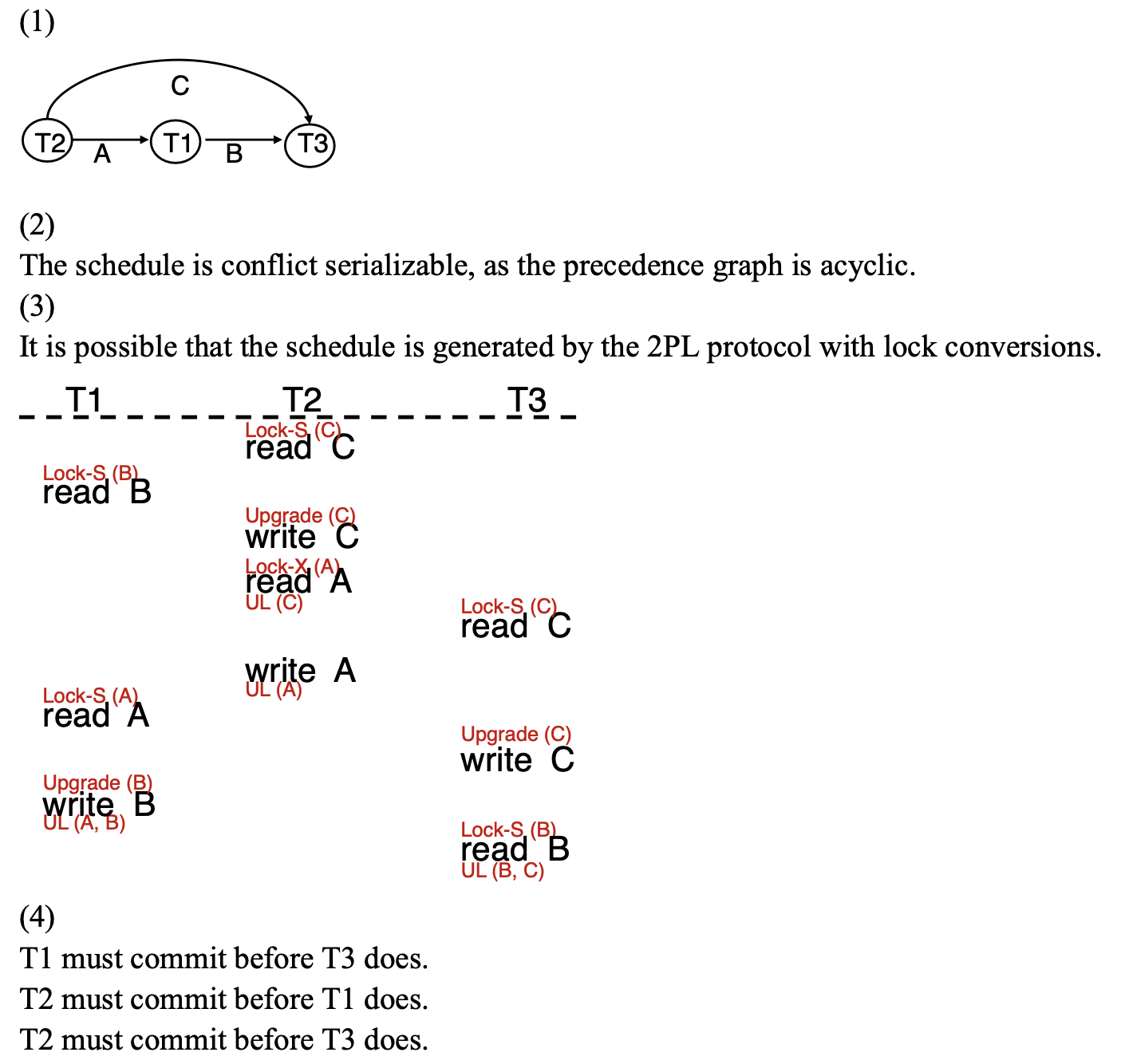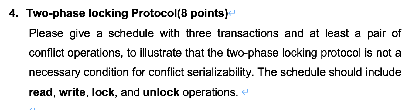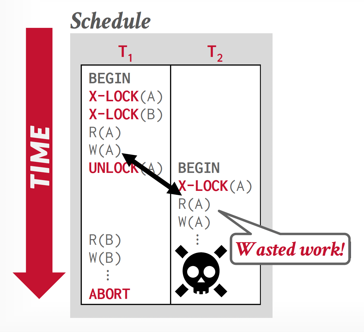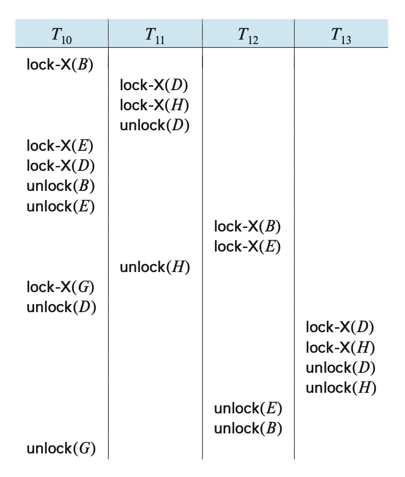 与两阶段锁的情况不同,共享锁可以在任何时候释放和获取;但独占锁在事务提交或中止之前不能被释放。该协议不保证可串行性。实际上,一个事务对同一个数据项进行两次读取,但可能会得到不同的结果。