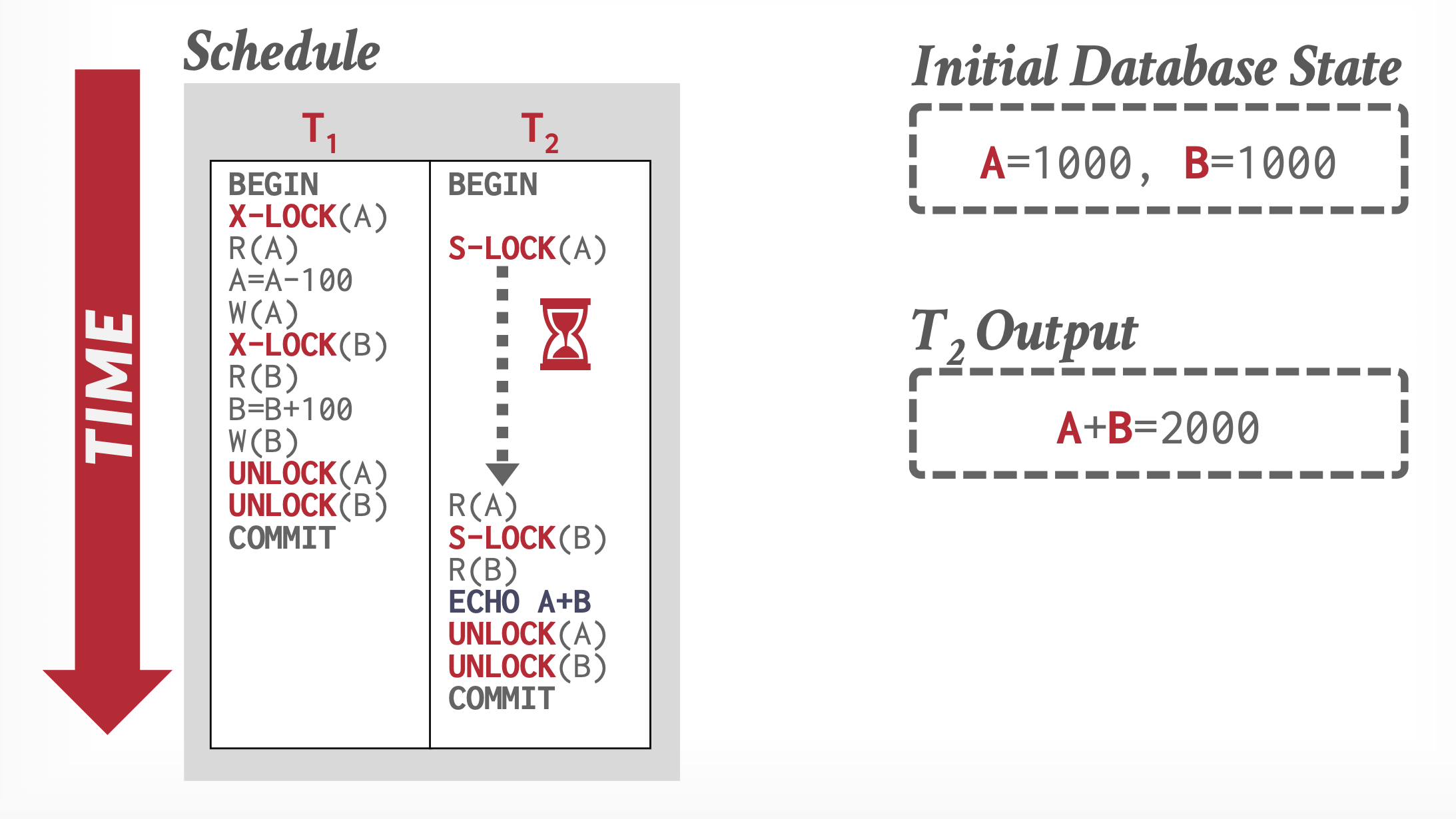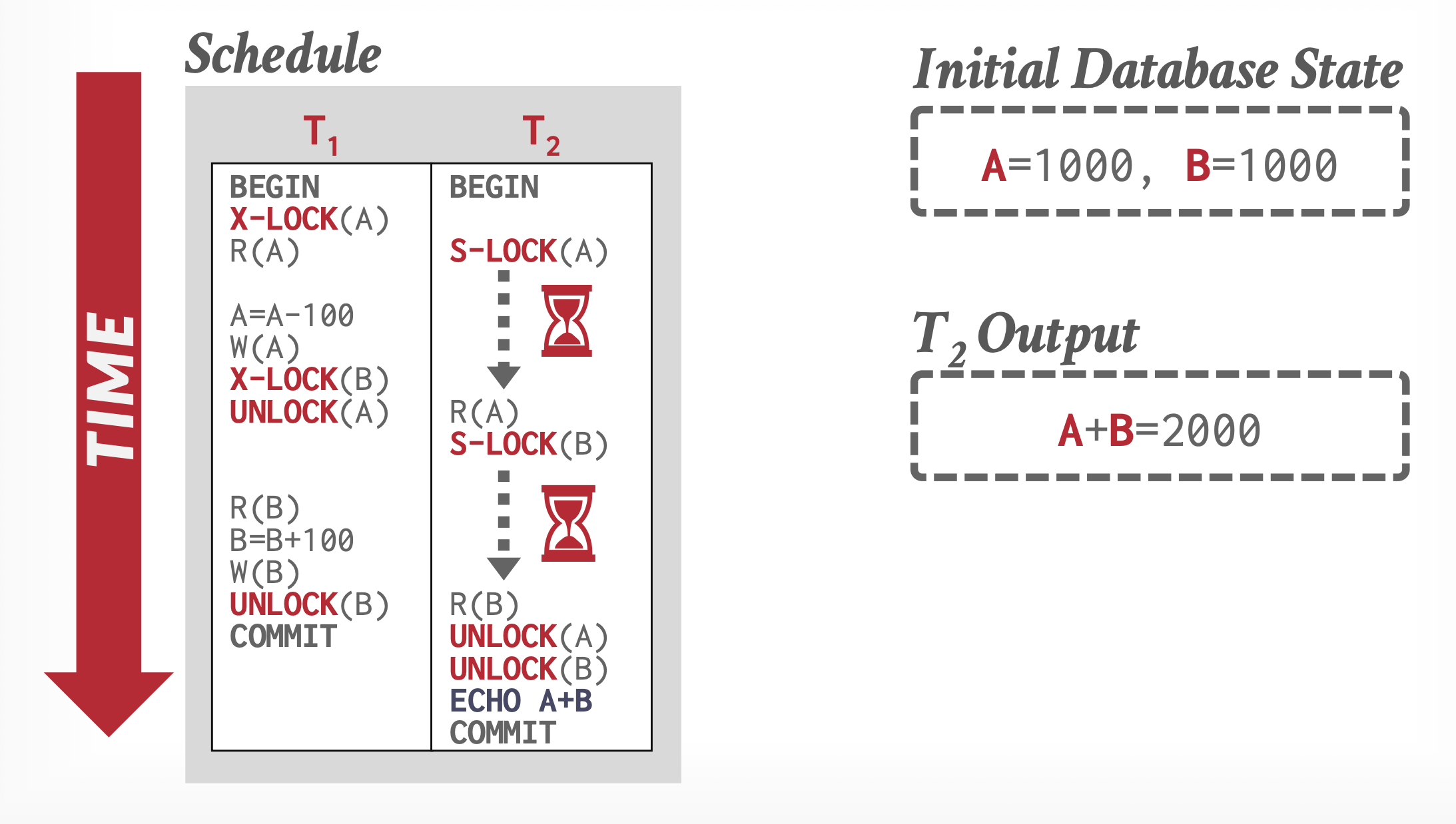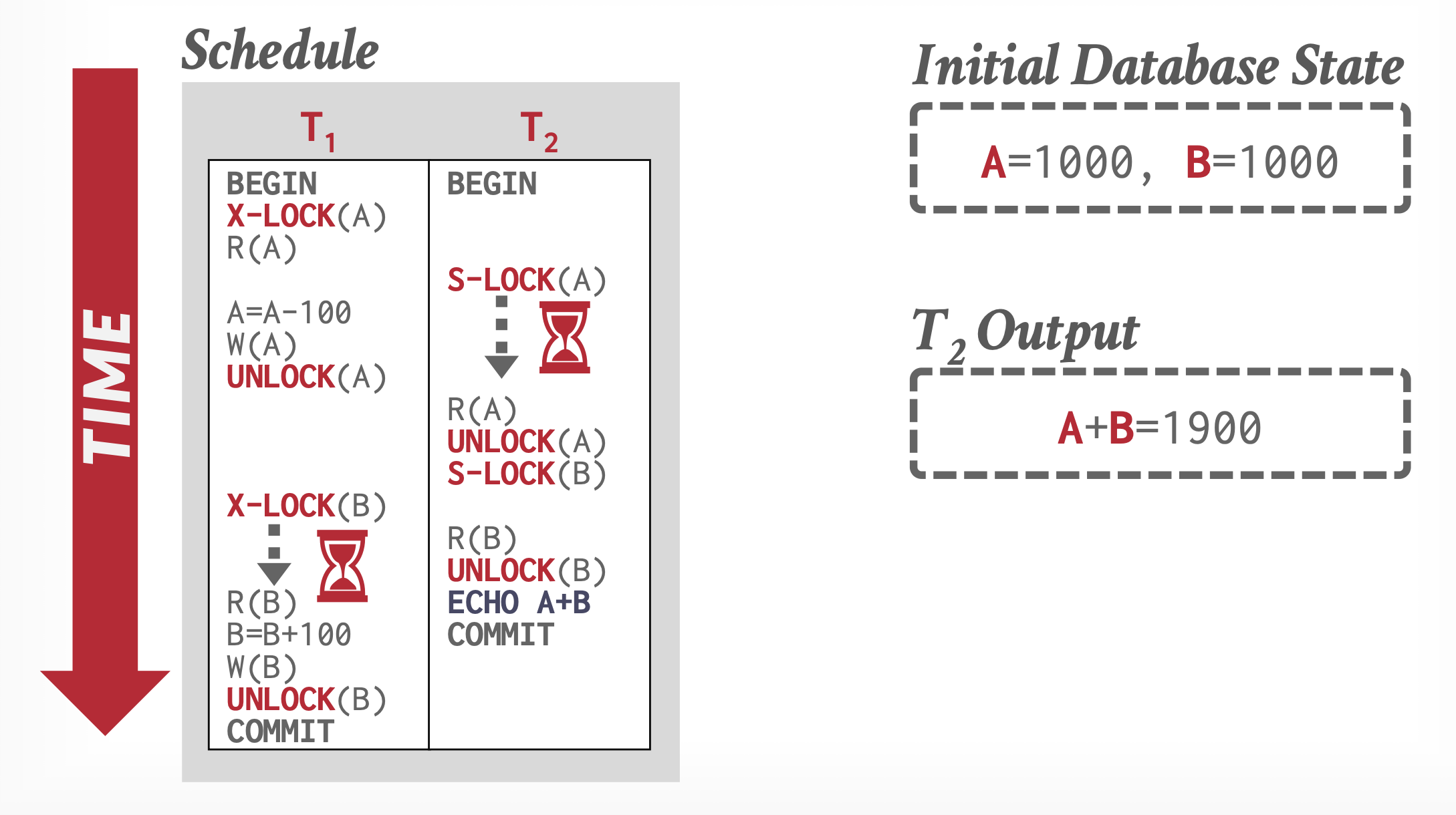 与两阶段锁的情况不同,共享锁可以在任何时候释放和获取;但独占锁在事务提交或中止之前不能被释放。该协议不保证可串行性。实际上,一个事务对同一个数据项进行两次读取,但可能会得到不同的结果。